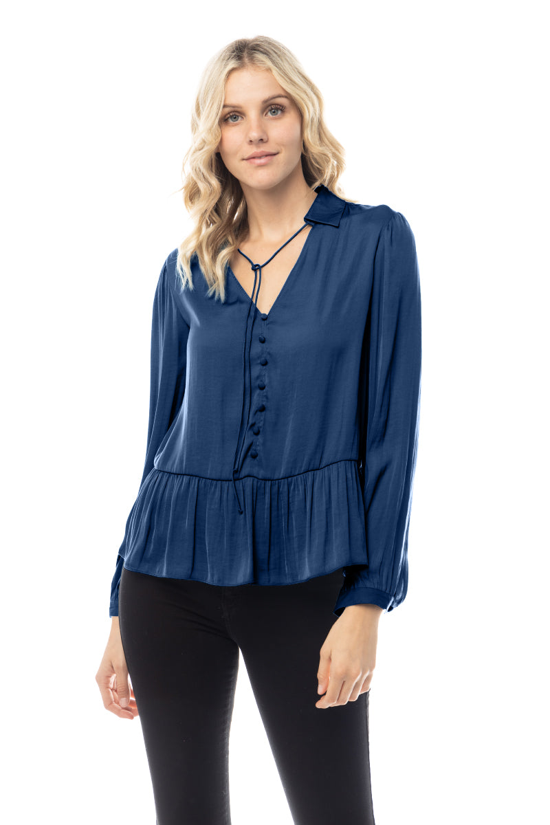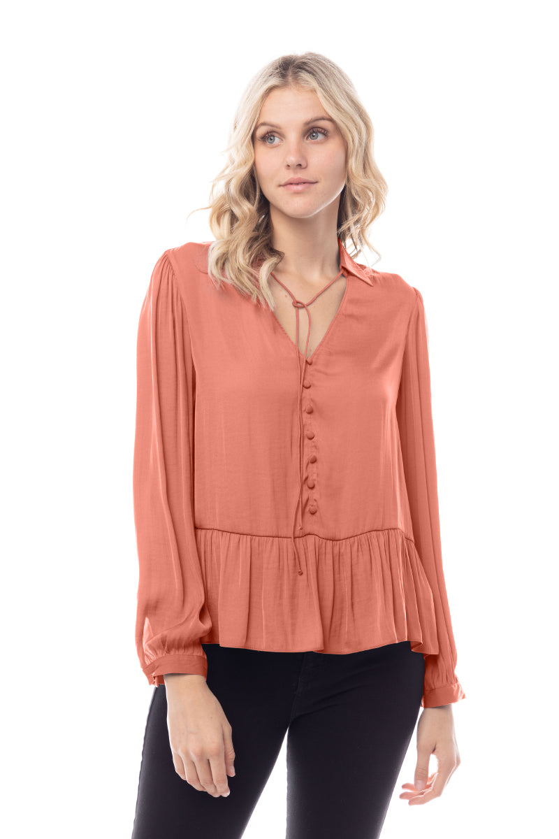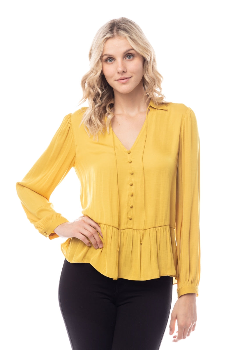 The Peplum Fake Button Down Blouse combines classic design with contemporary flair. Featuring a peplum waist for a flattering fit and faux button-down detailing, this blouse offers a chic and polished look. Ideal for both casual and formal settings, it adds a stylish and sophisticated touch to your wardrobe.