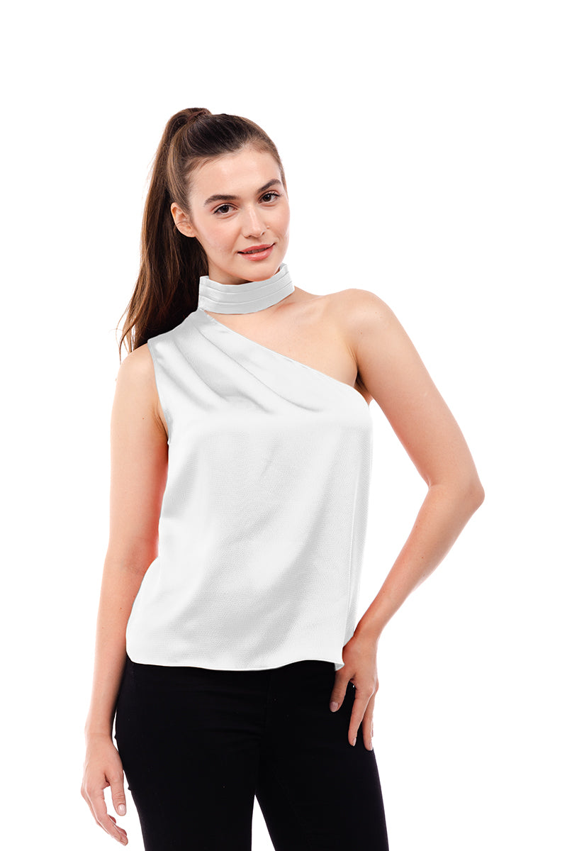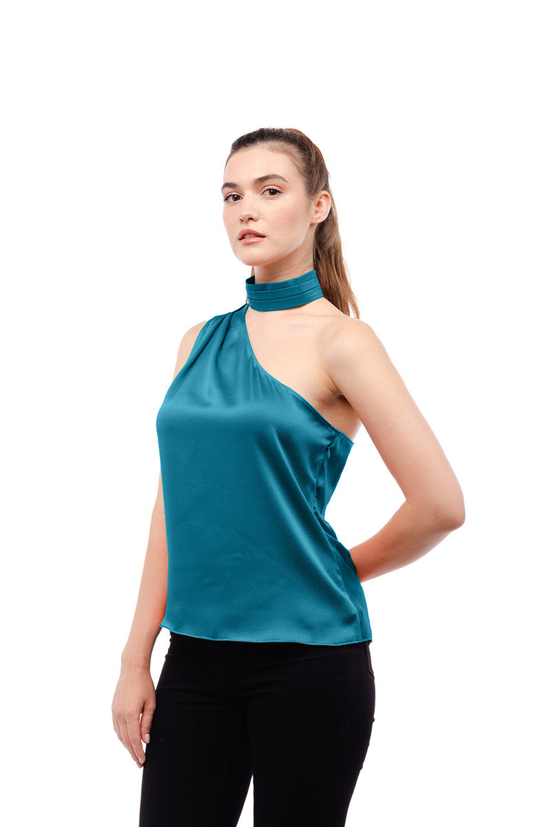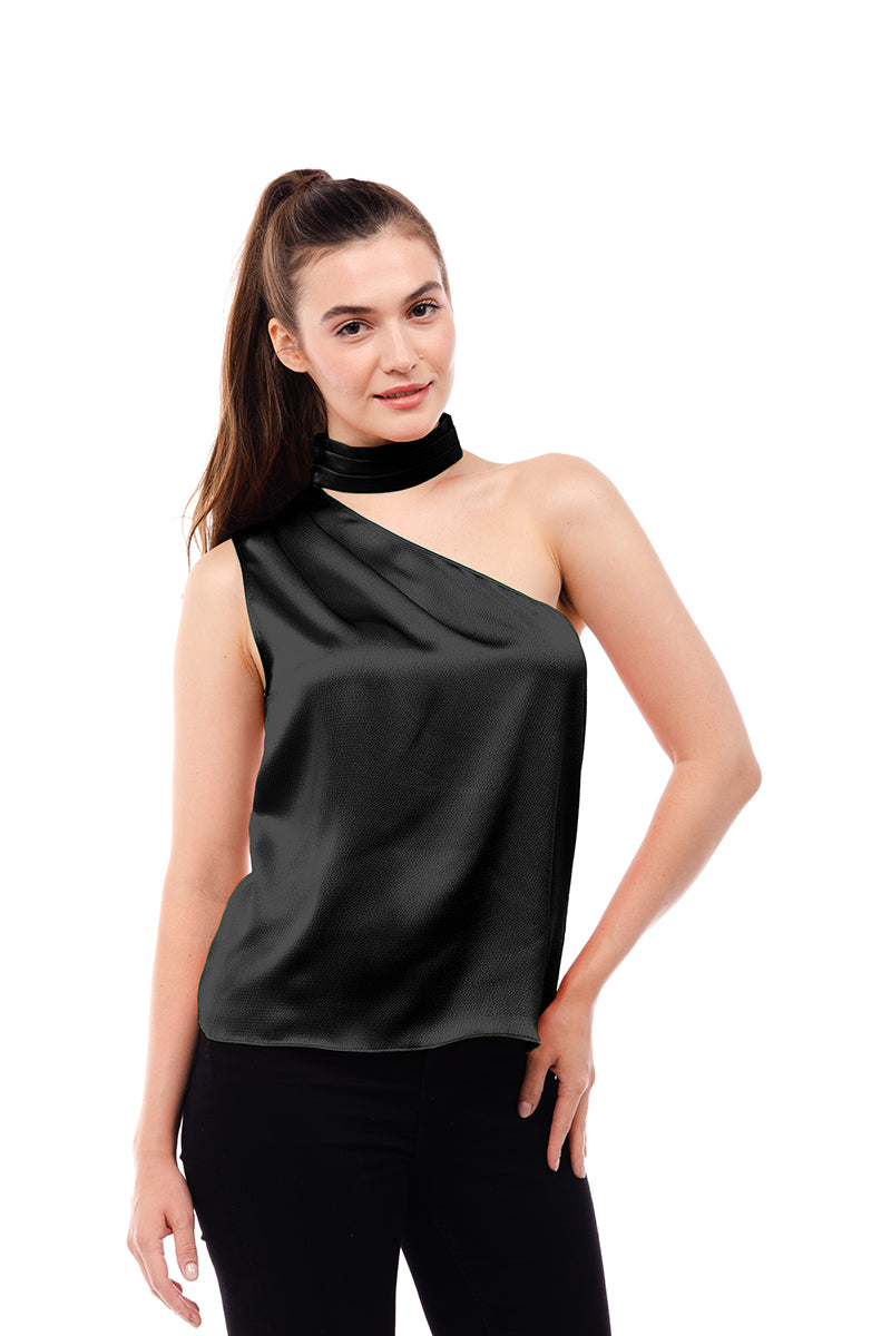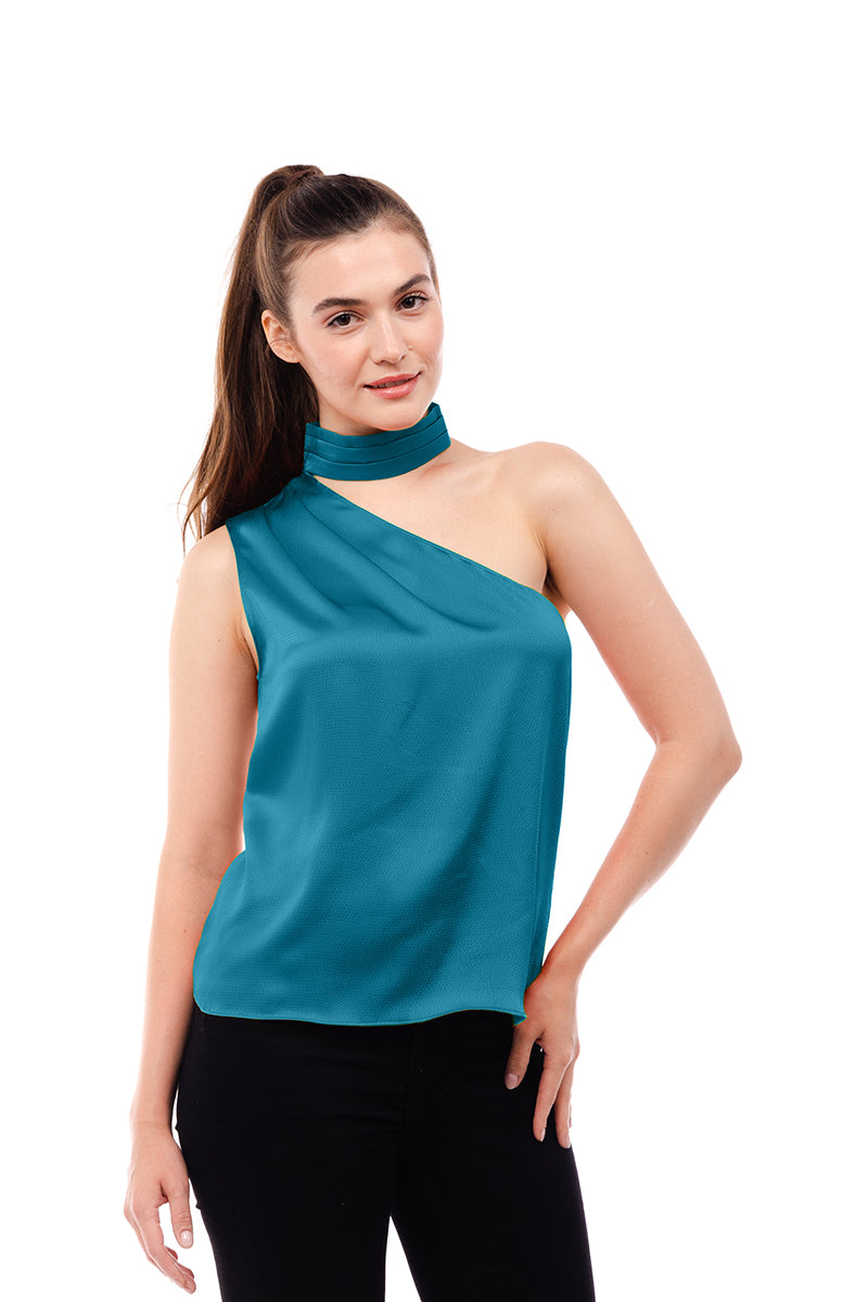 ╴Women's Pleated Neck Asymmetrical Top.
