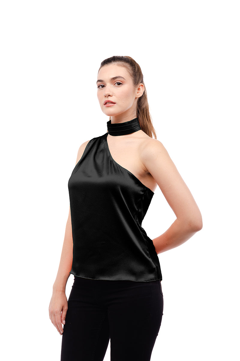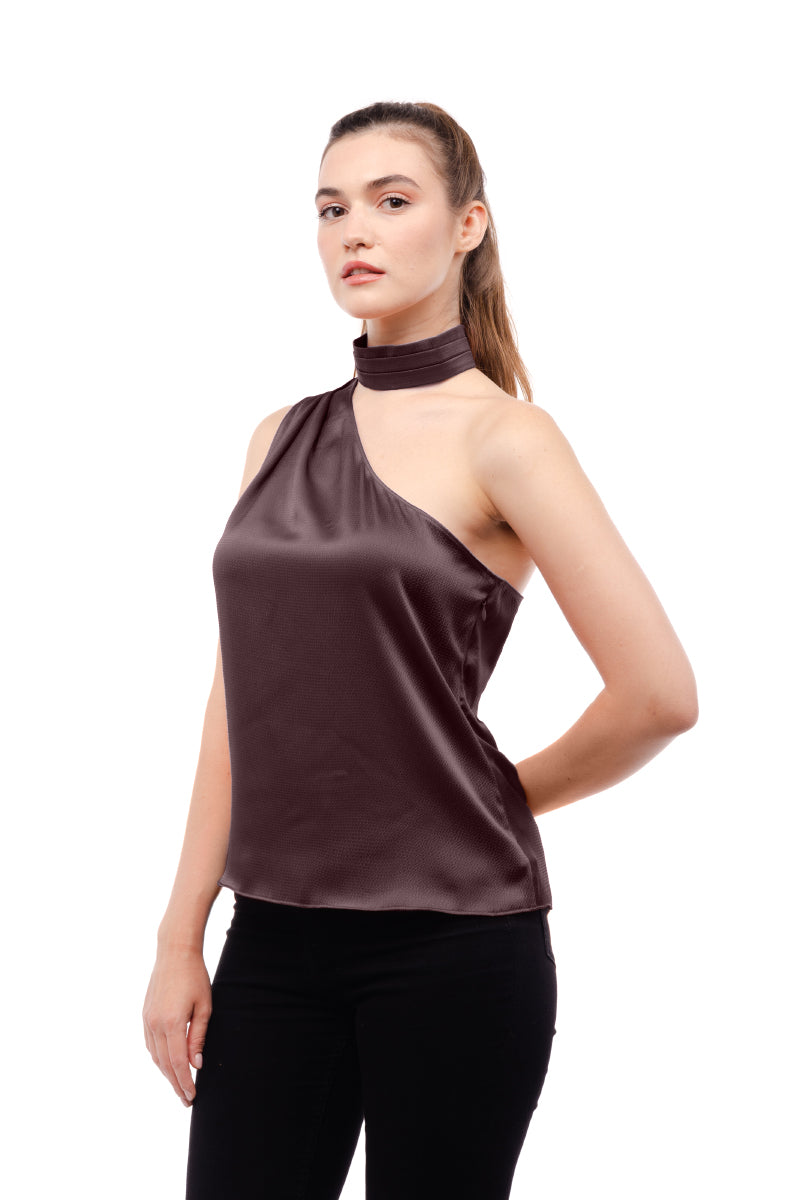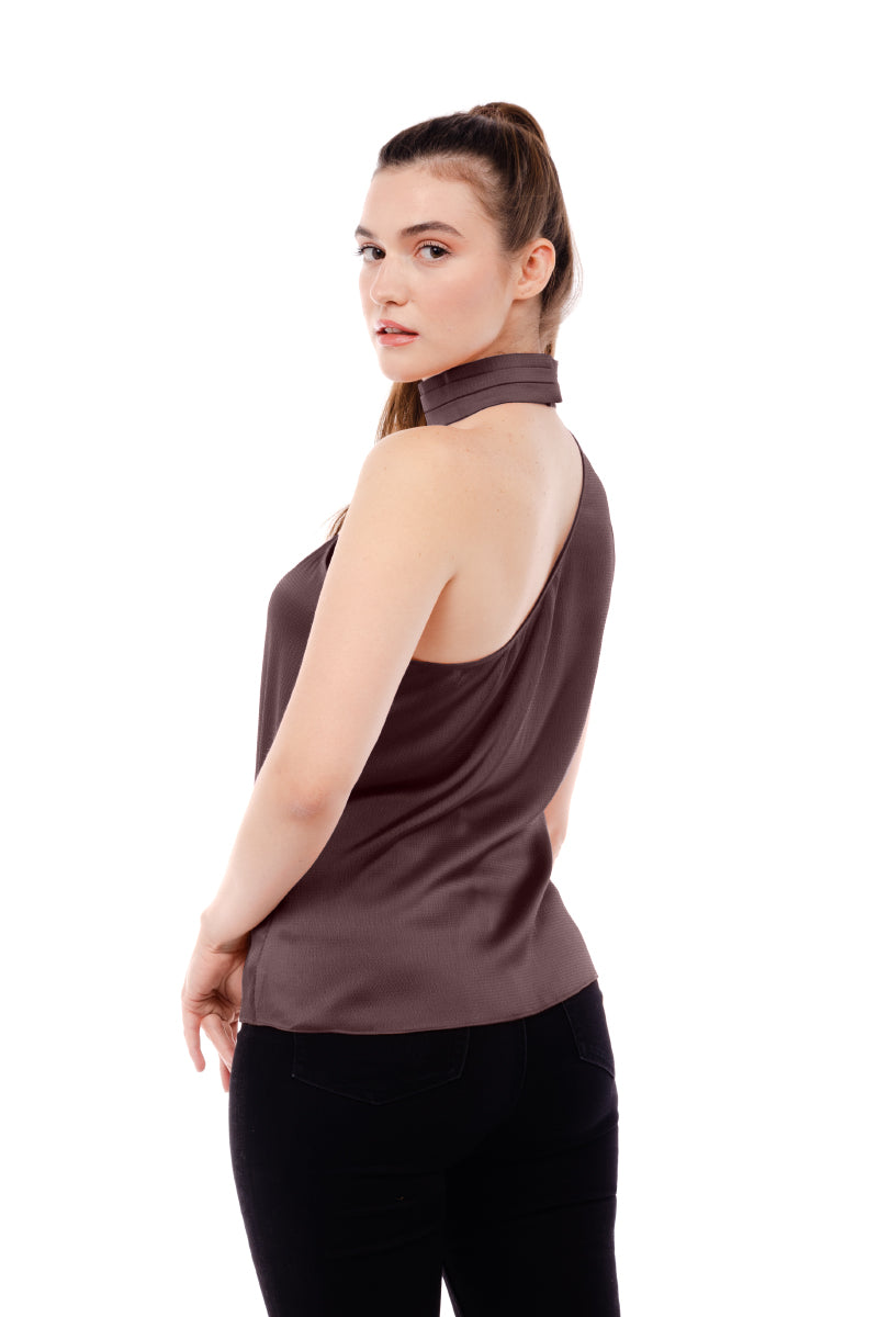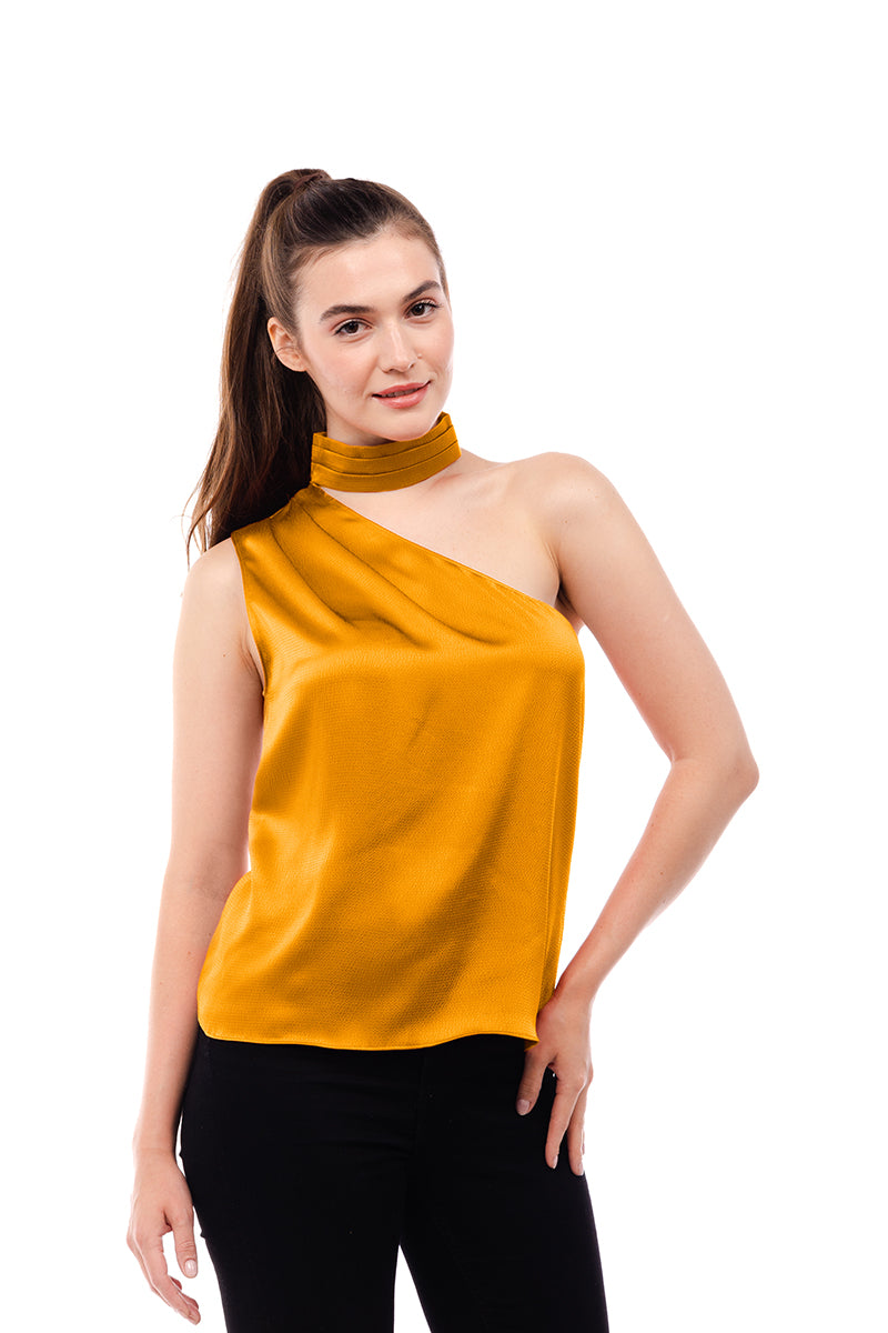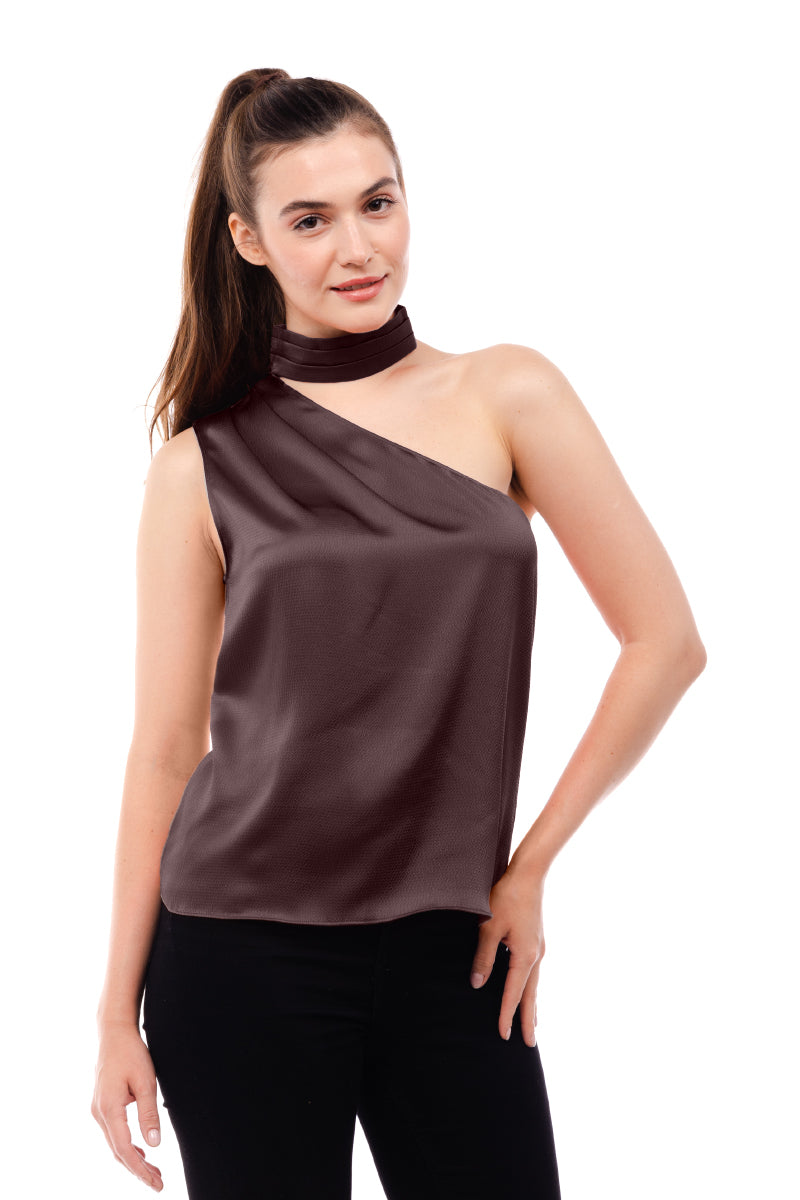 ╴Women's Pleated Neck Asymmetrical Top.
