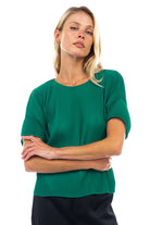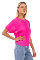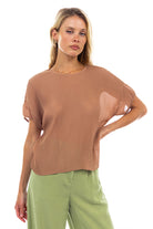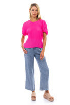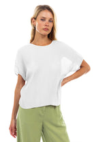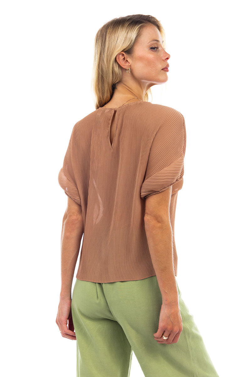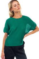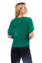 This blouse features sheer, pleated short sleeves that add a light, elegant touch to its design. Perfect for both office settings and social outings, it combines sophistication with a breezy, comfortable fit.