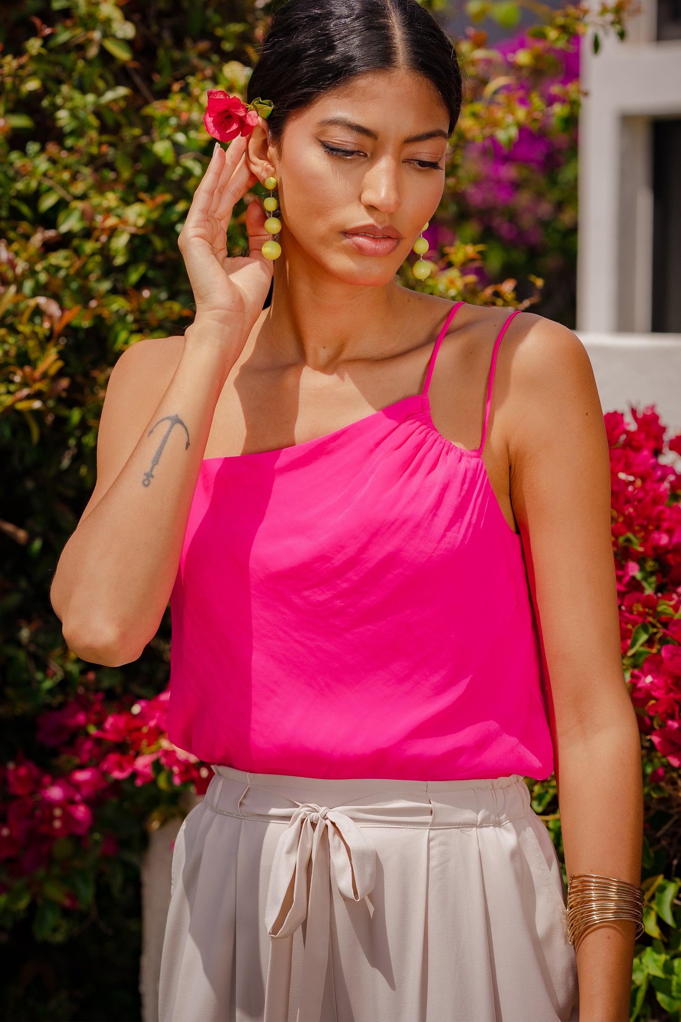 ╴Asymmetrical neckline with slim straps for a modern edge.