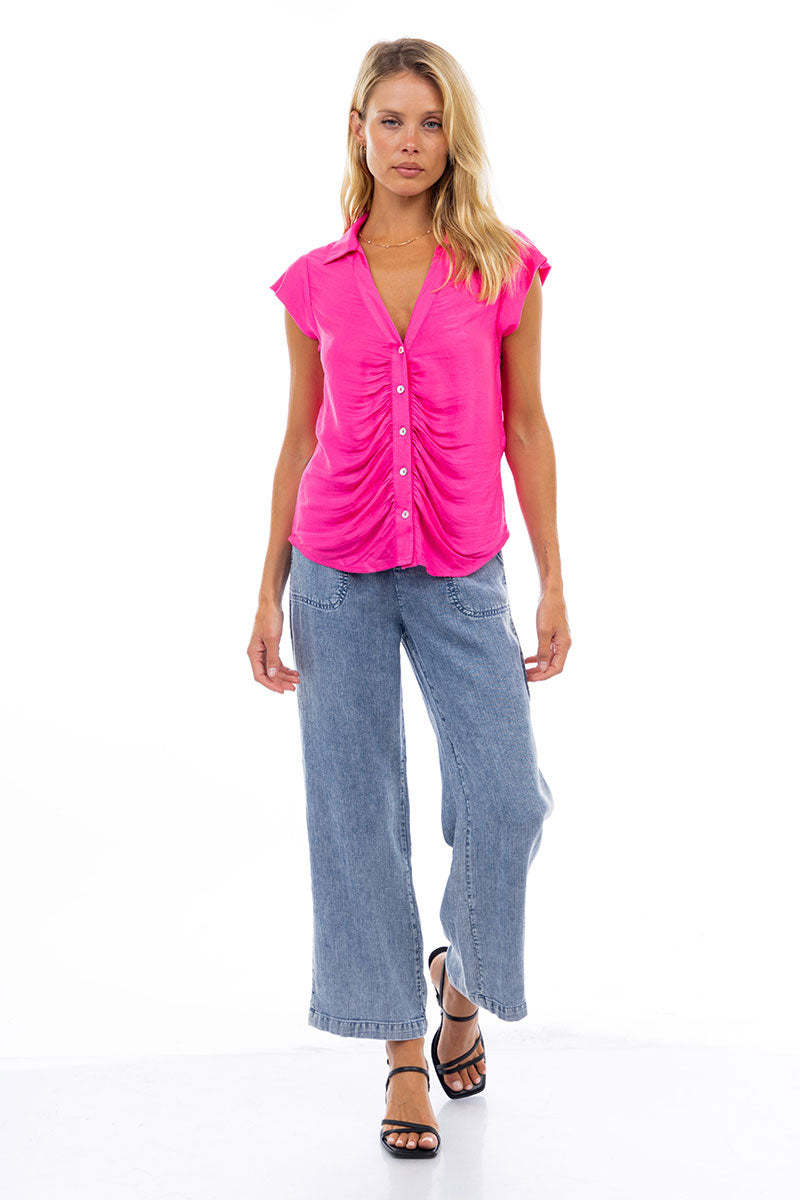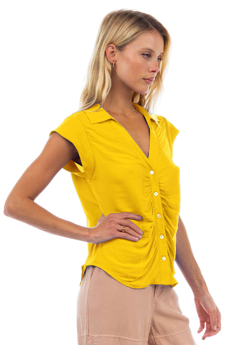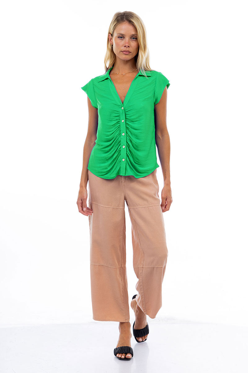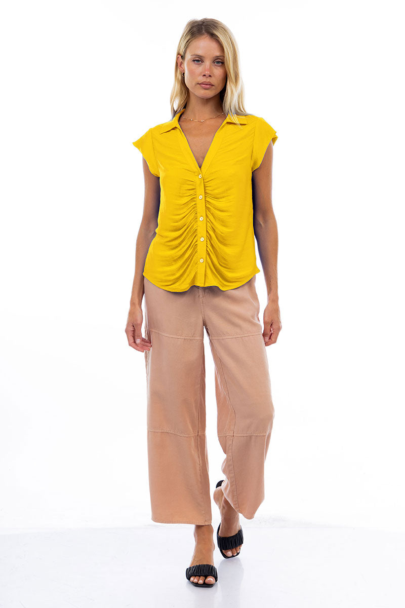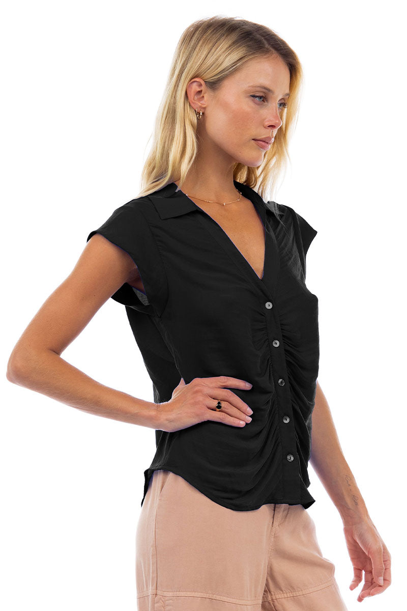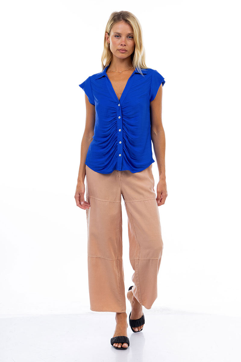 Ruched Button Down Cap Sleeve Blouse