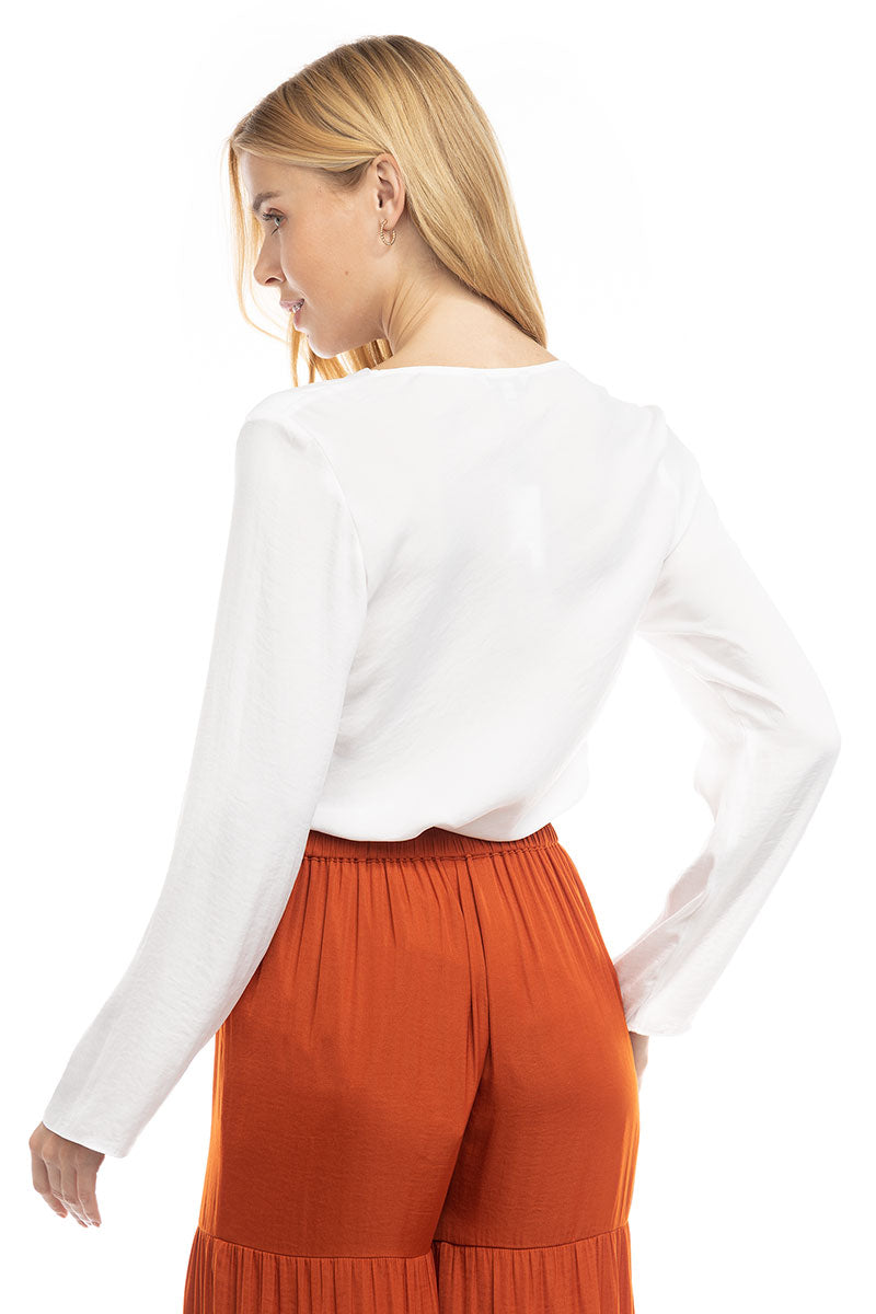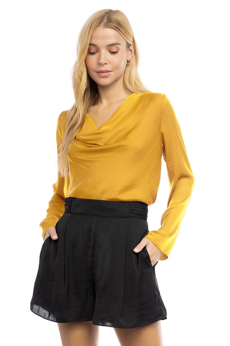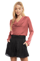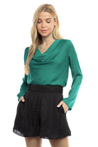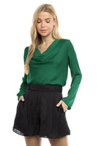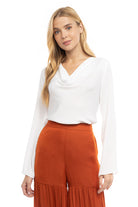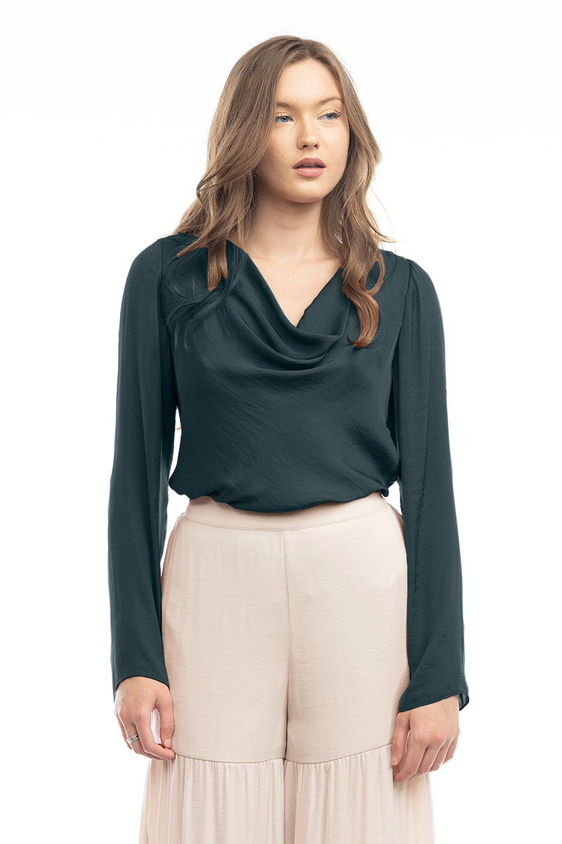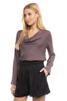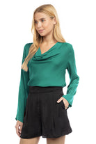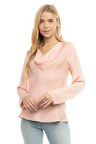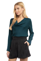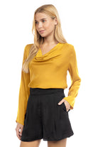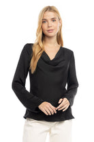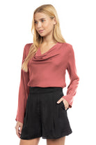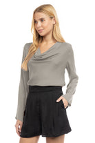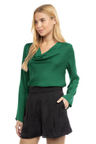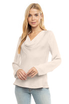 This Cowl Neck Long Sleeve Blouse is defined by its delicate drape, creating a subtle and refined neckline that adds a touch of sophistication to your attire. The long sleeves offer a versatile choice for various occasions, ensuring both comfort and style. This blouse effortlessly combines a chic silhouette with an elegant charm, making it a versatile and timeless piece for your wardrobe.