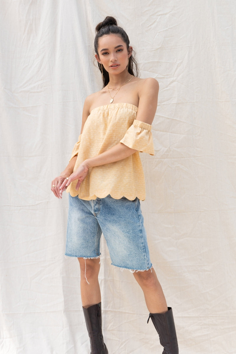 ╴Scalloped edges add a soft, feminine finish to this off-shoulder silhouette.