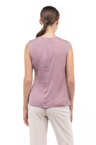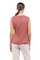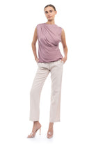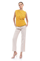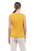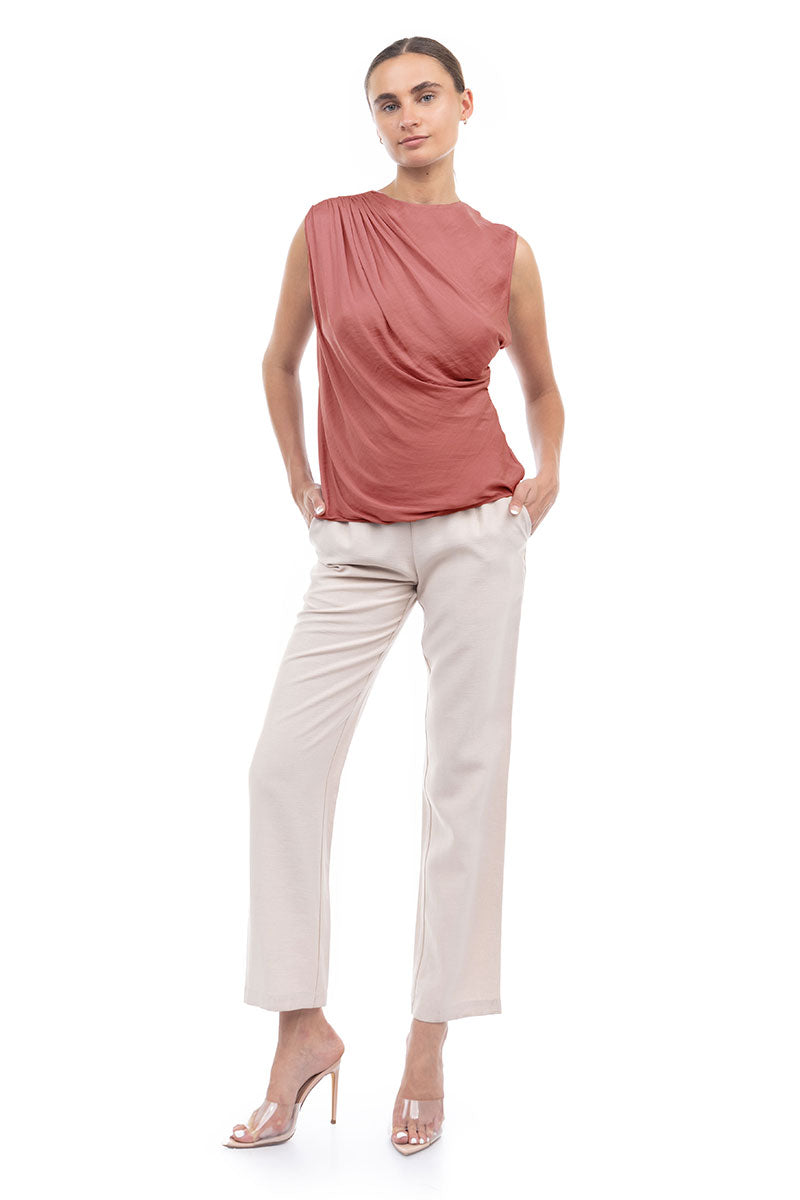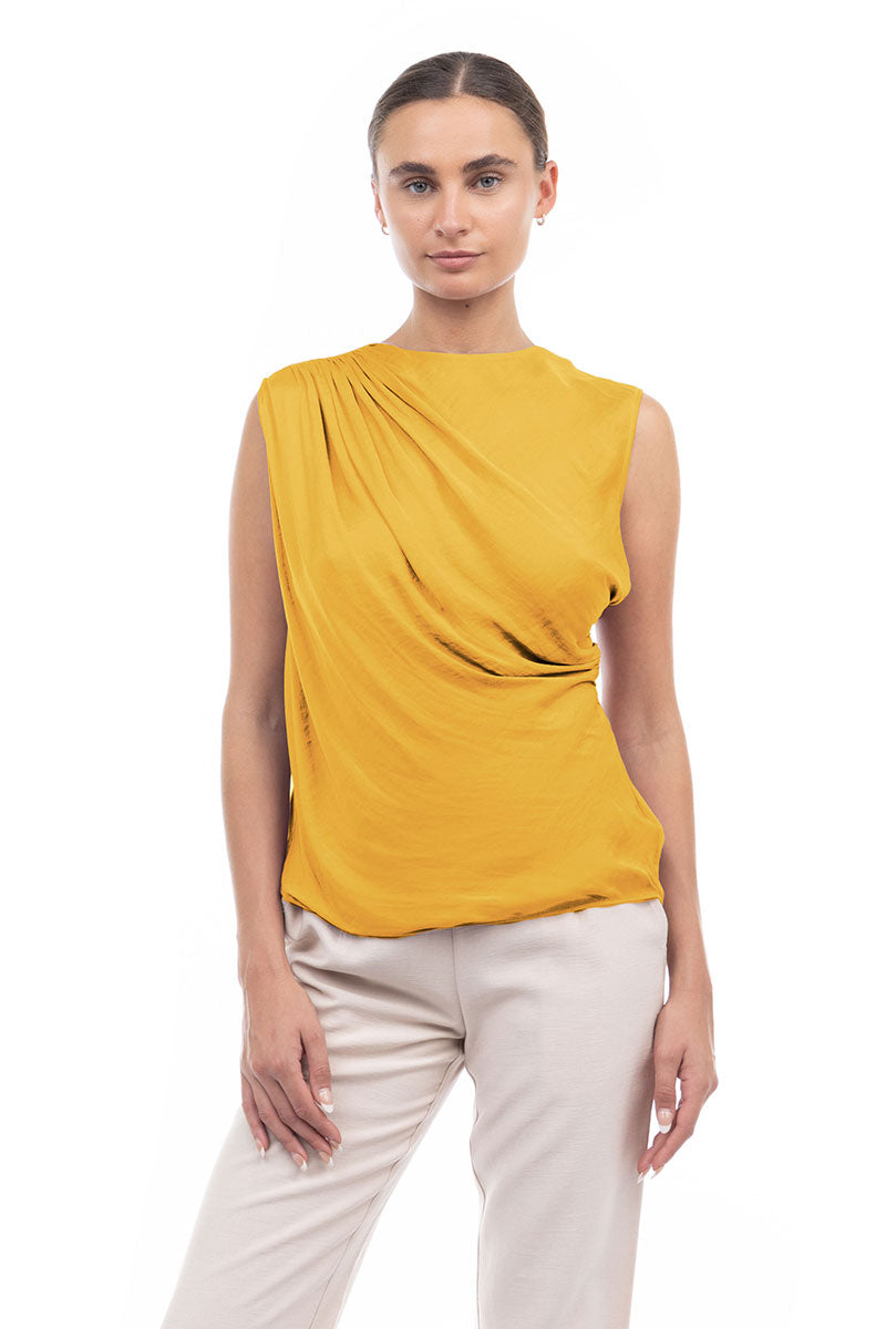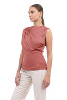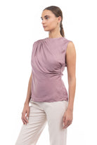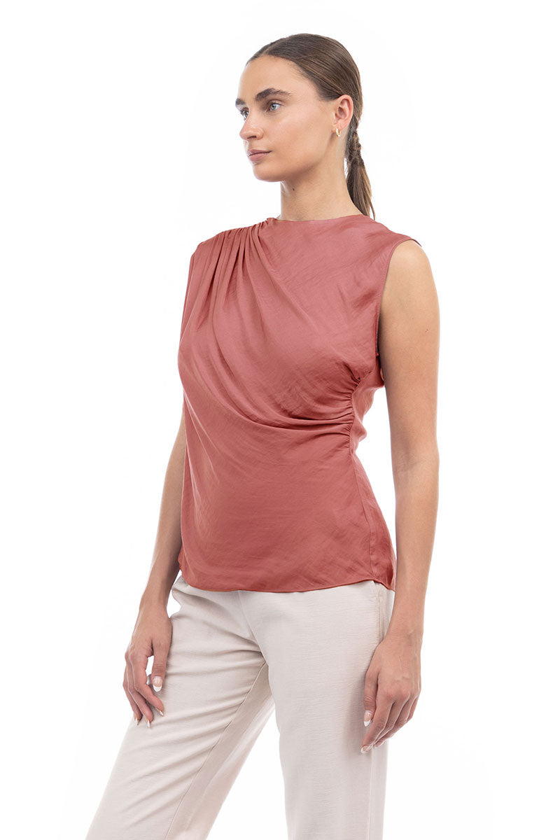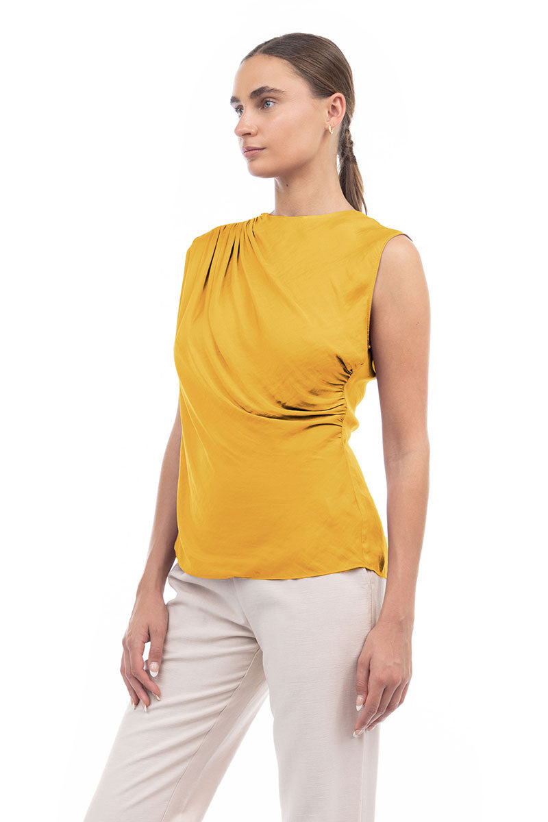 Sleeveless top featuring a stylish shirred gather at the shoulder—a subtle detail that adds a touch of texture and elevates the overall look. Effortlessly chic, this design offers a modern and flattering silhouette while maintaining a simple and versatile appeal.