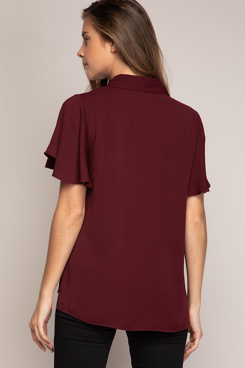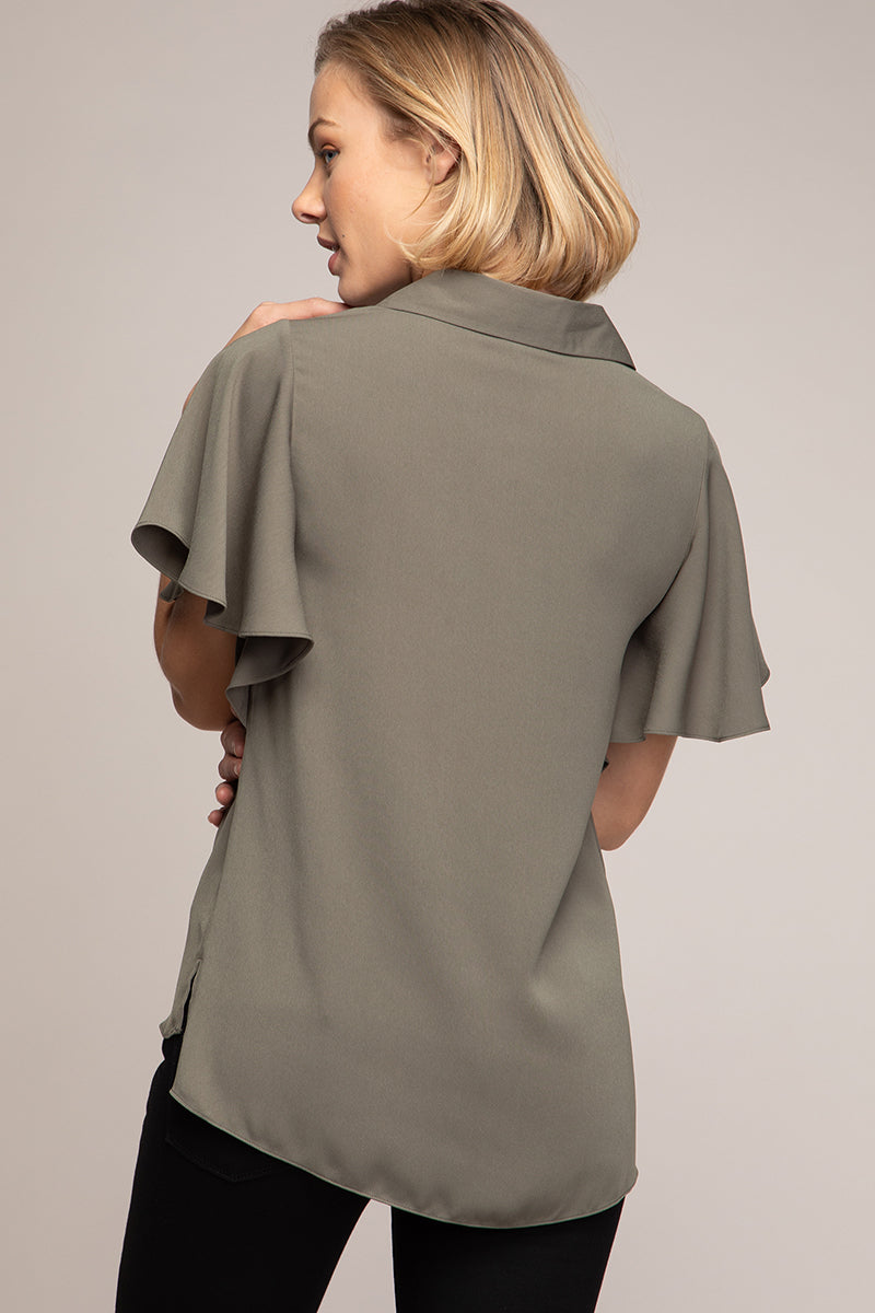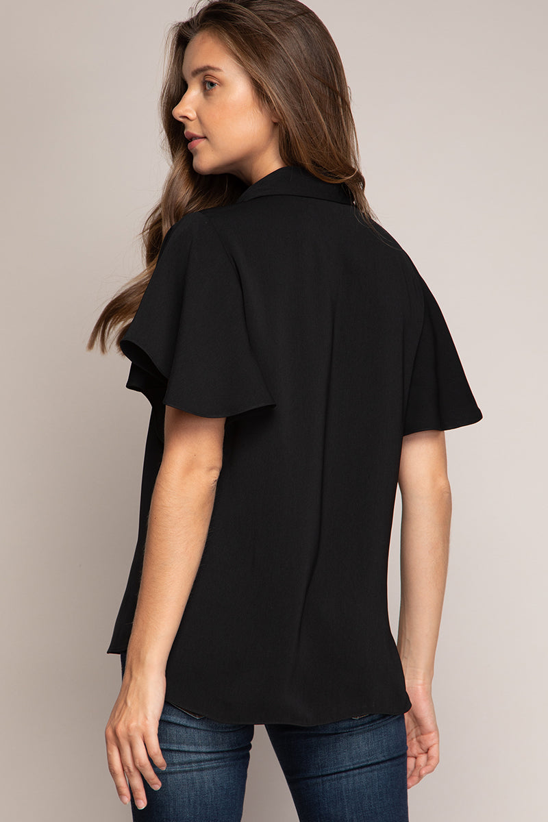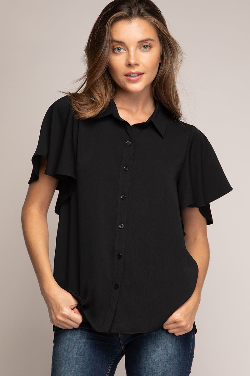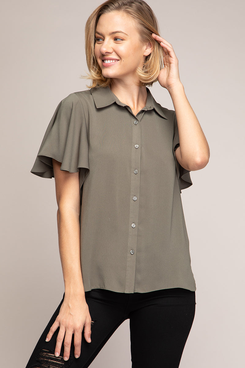 Short Flutter Sleeve Button Down Blouse