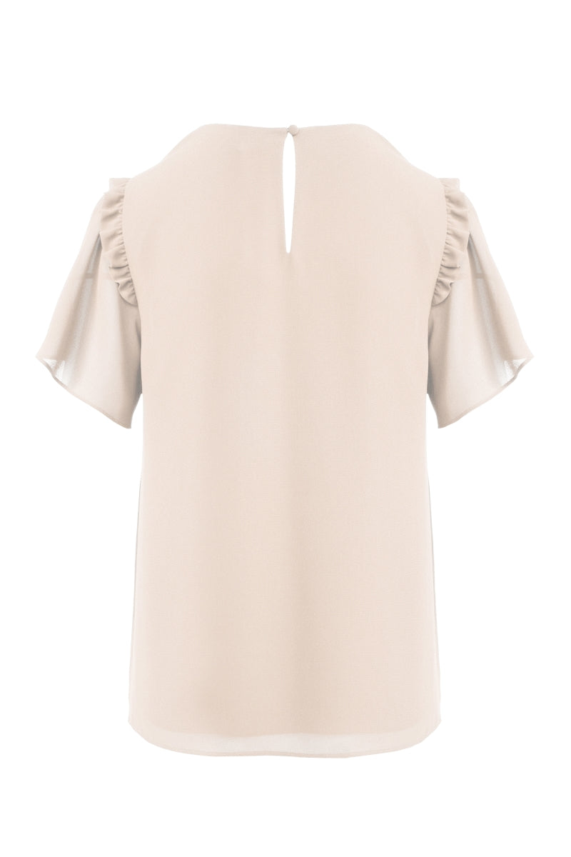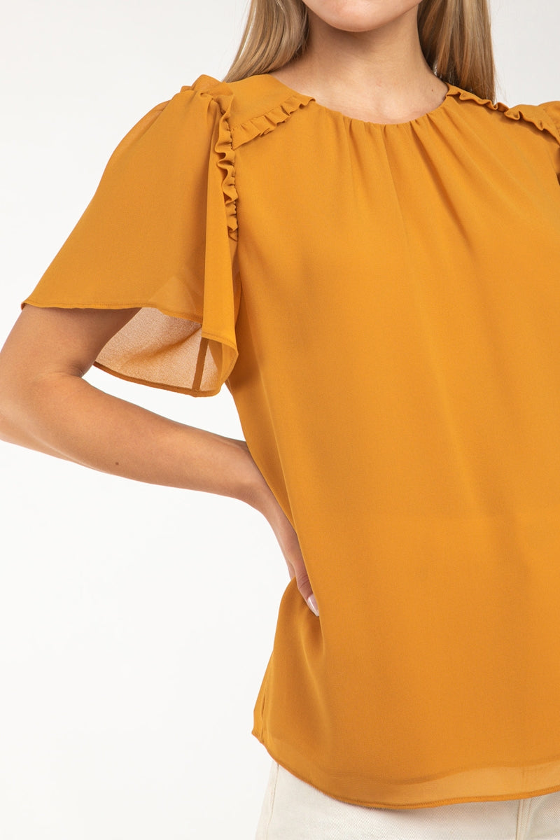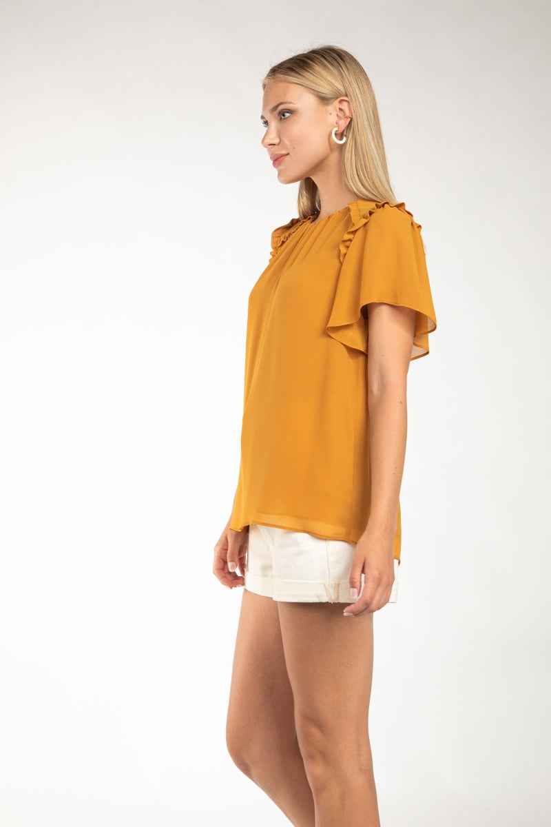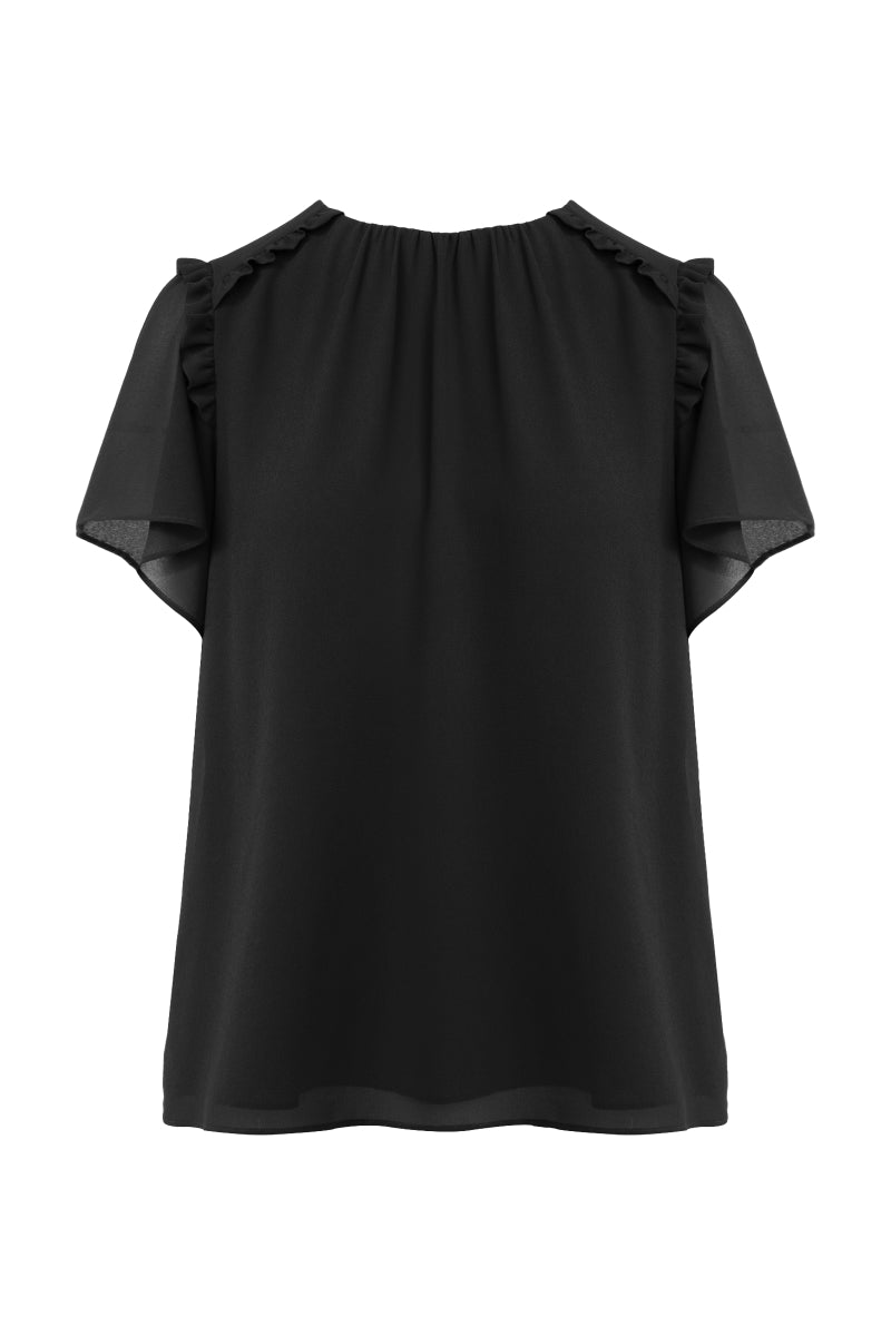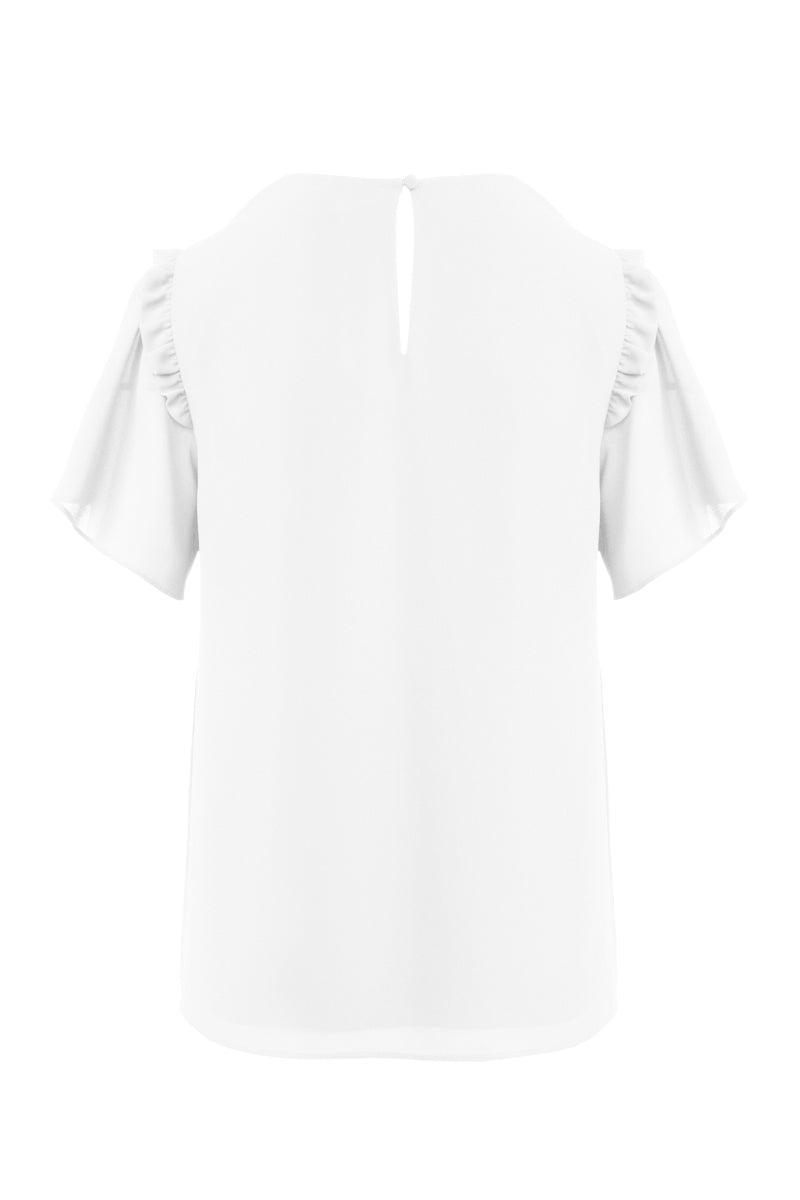 ╴Women's Short Sleeve Blouse with Ruffle Trim.