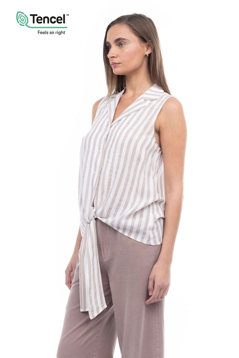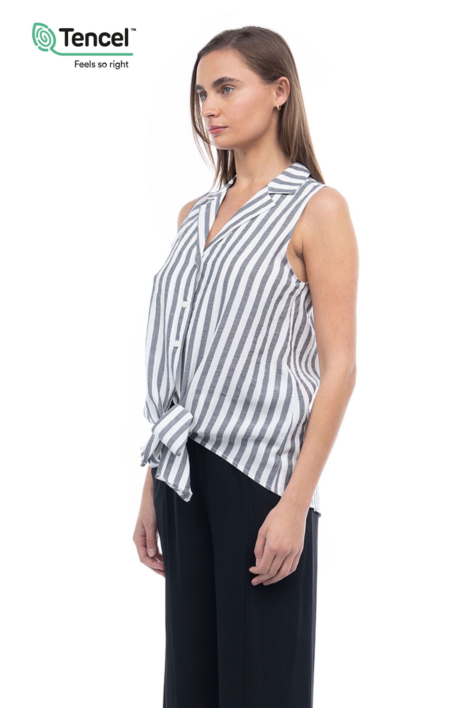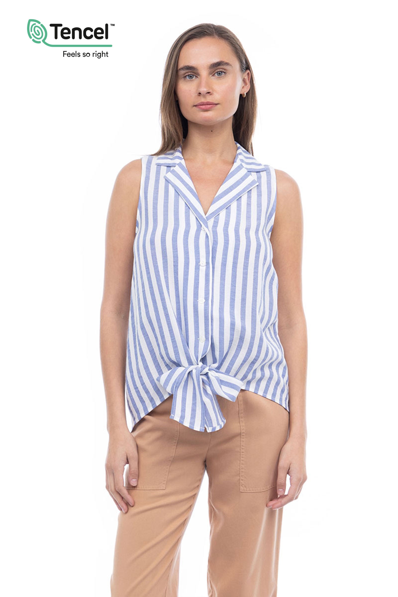╴Crisp button-down design with a sleeveless cut and playful front tie detail.