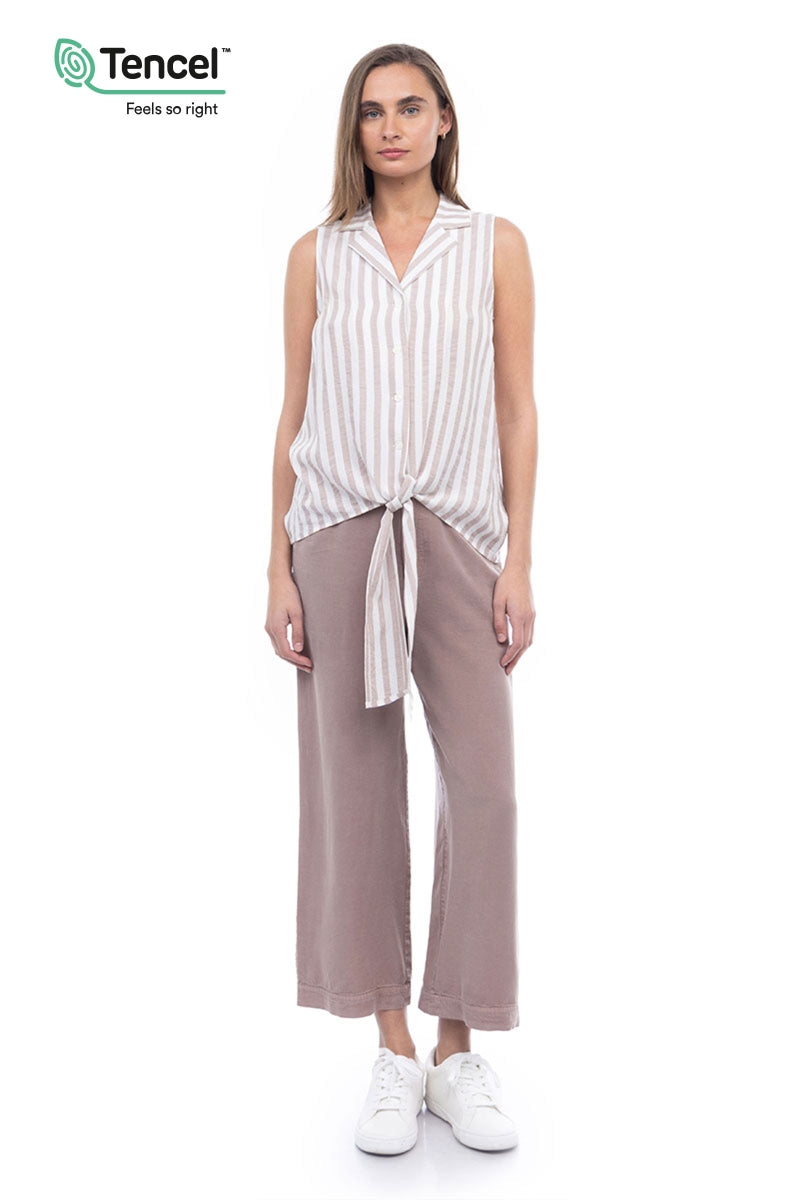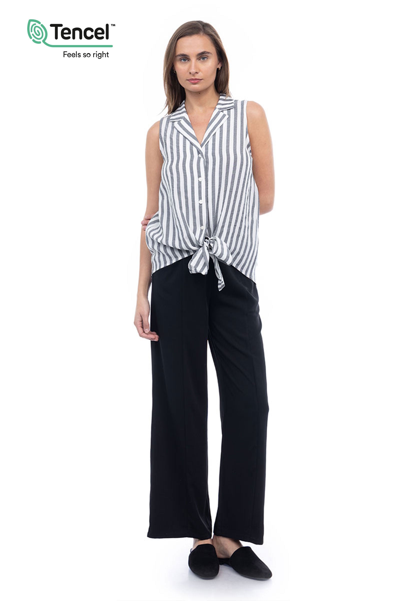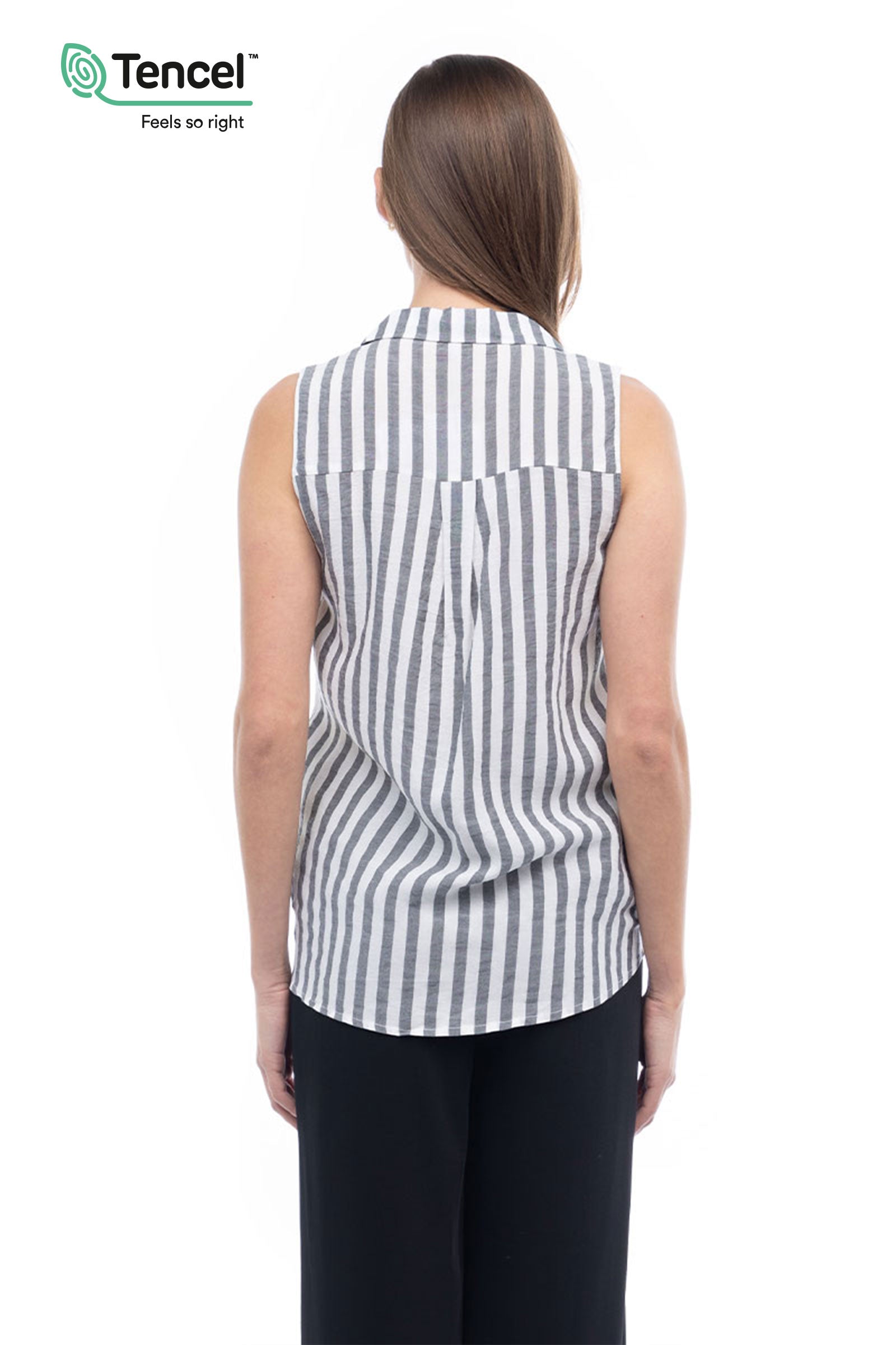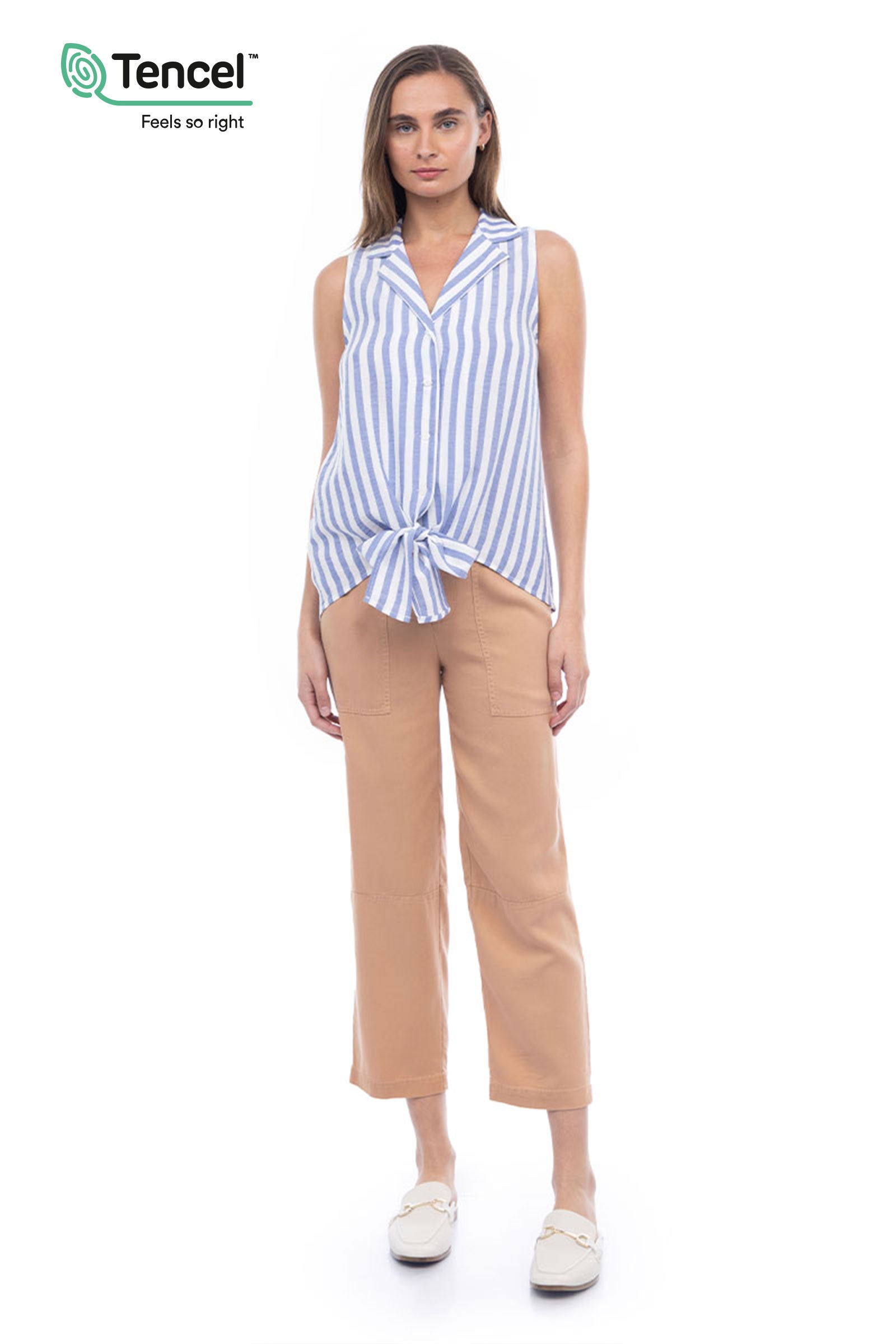╴Crisp button-down design with a sleeveless cut and playful front tie detail.