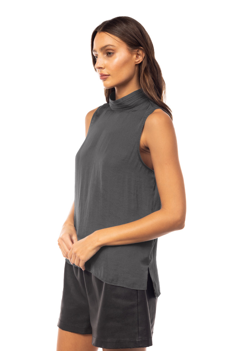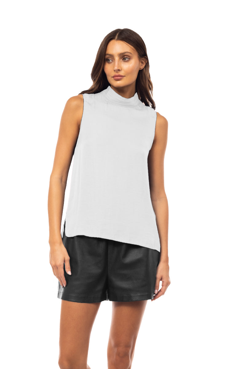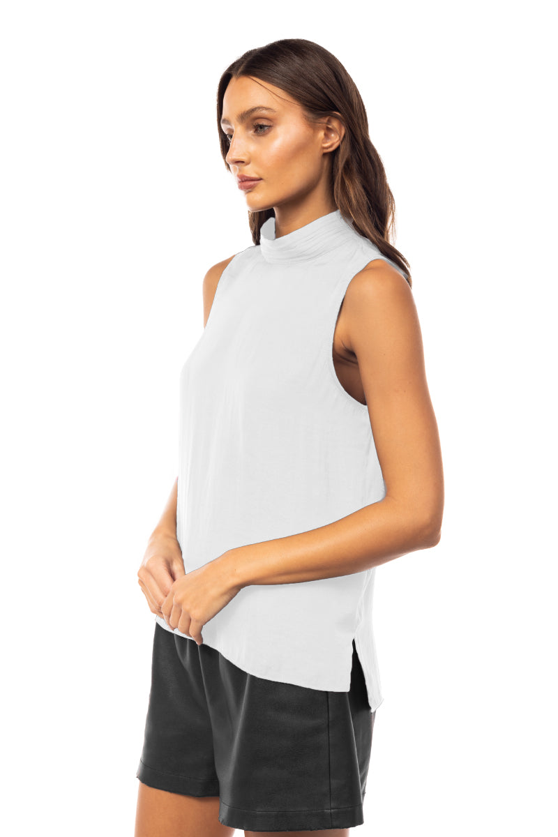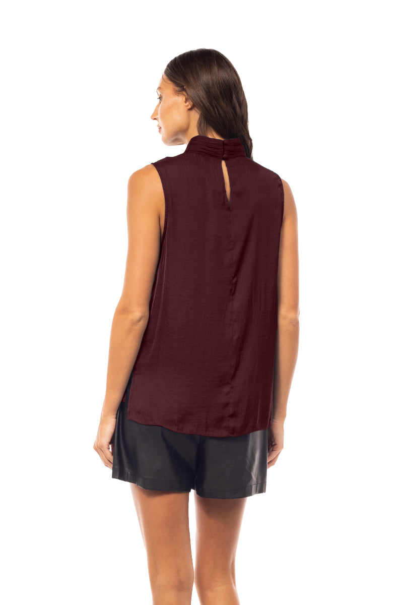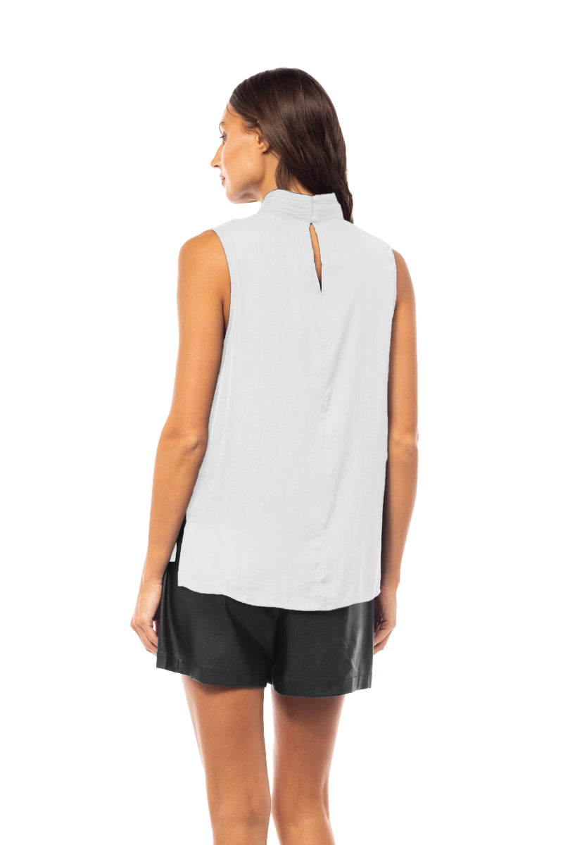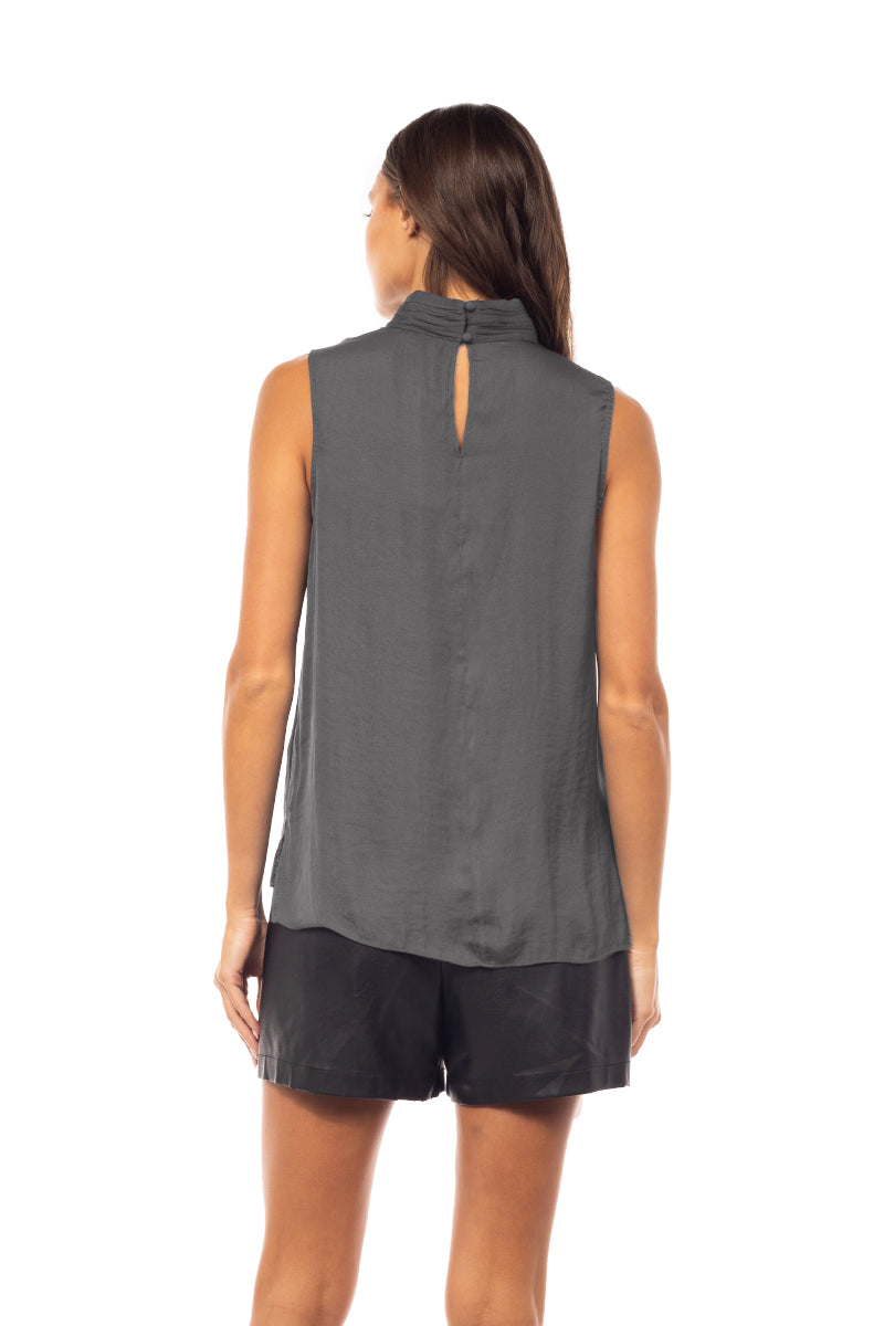 ╴Elegant mock neck design with delicate pleating and a sleeveless cut for a modern touch.