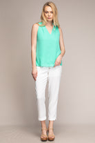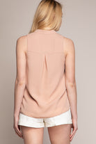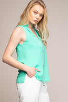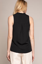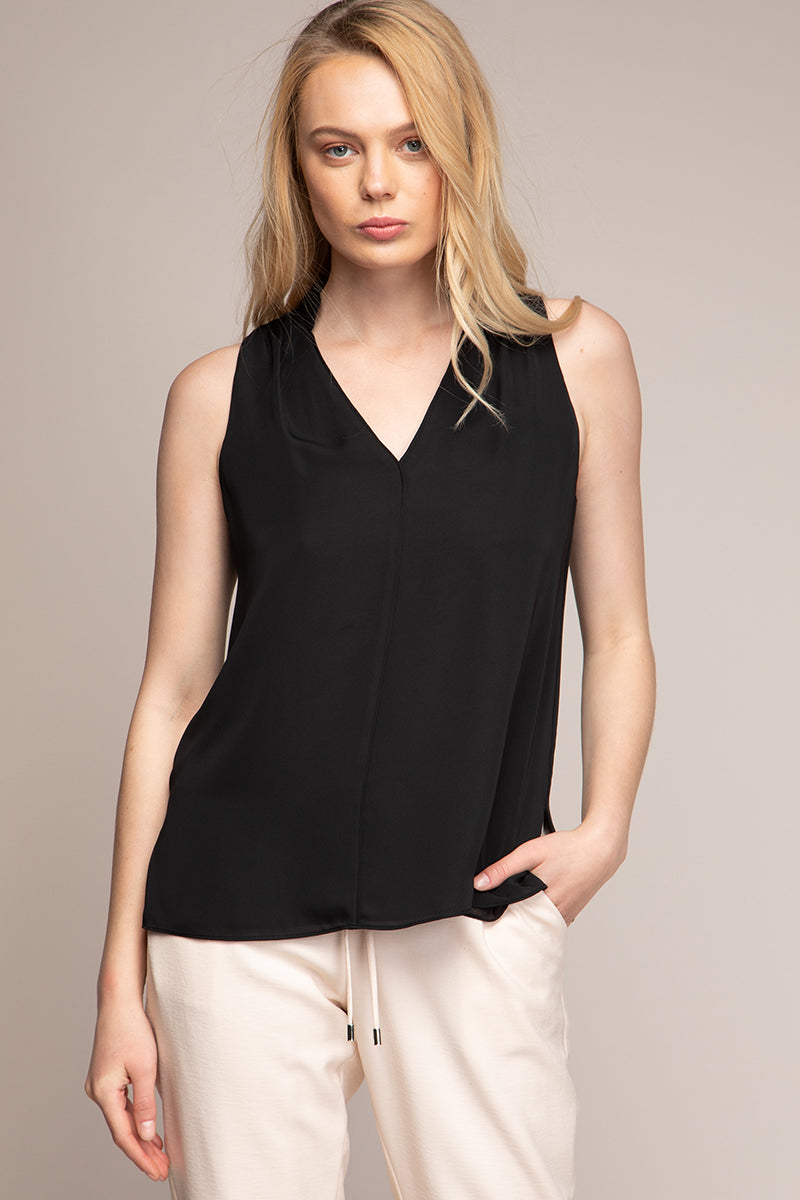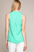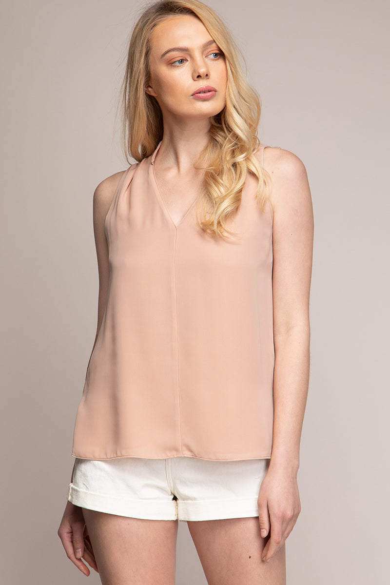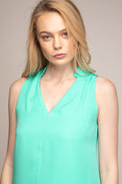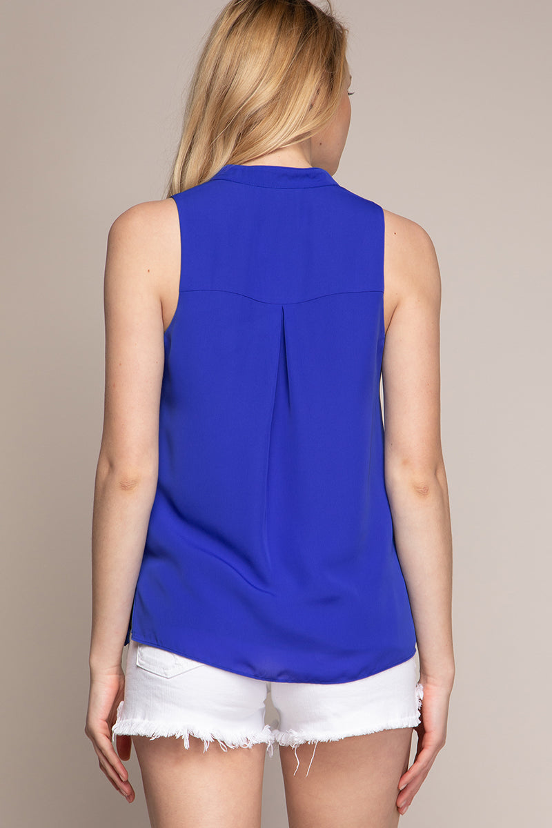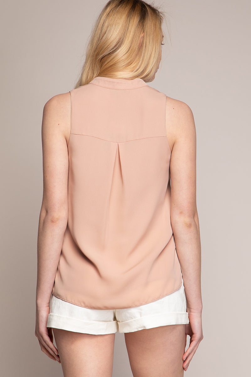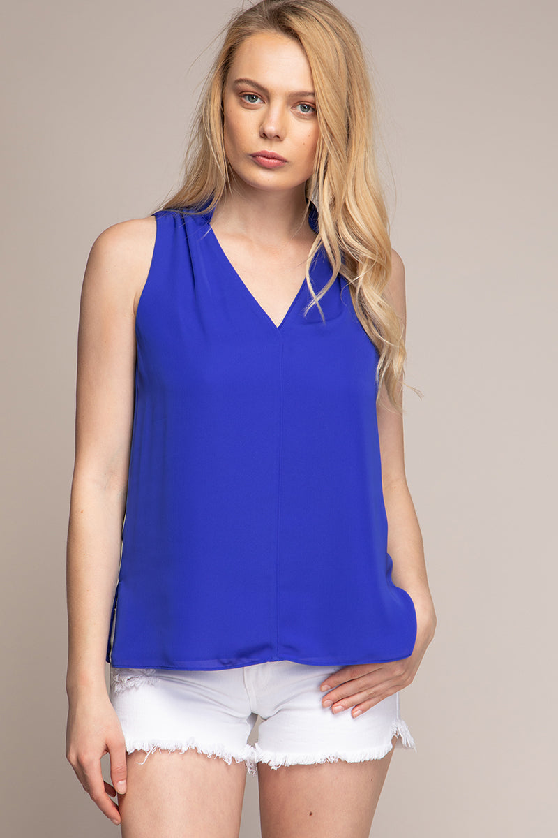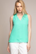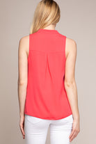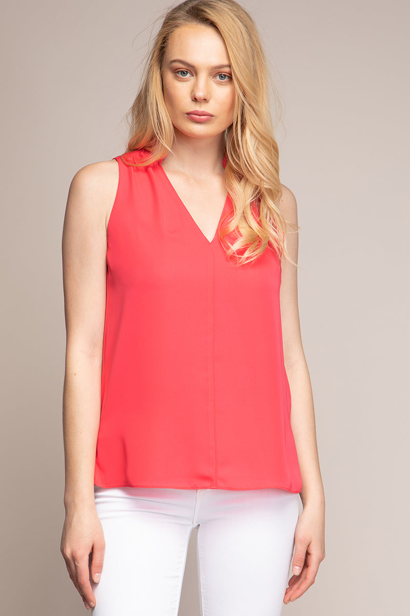 women’s sleeveless V-neck blouse with piping detail