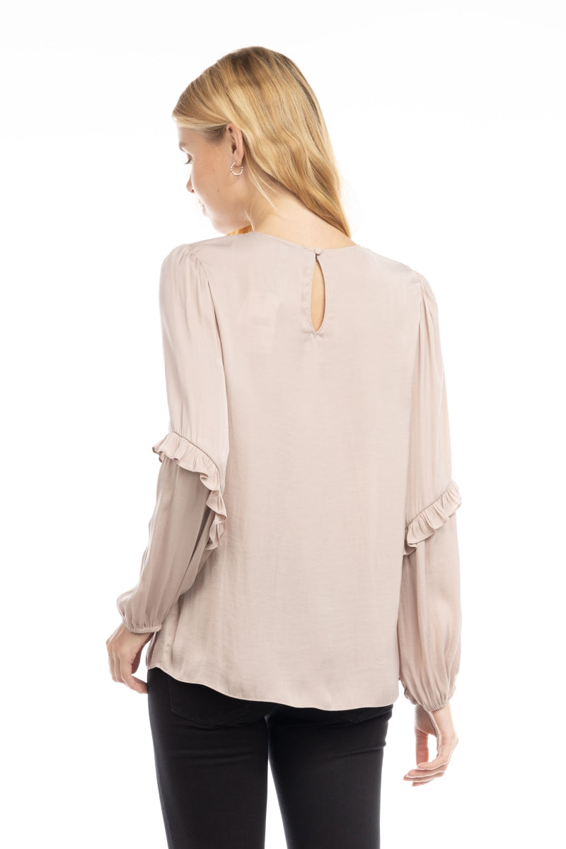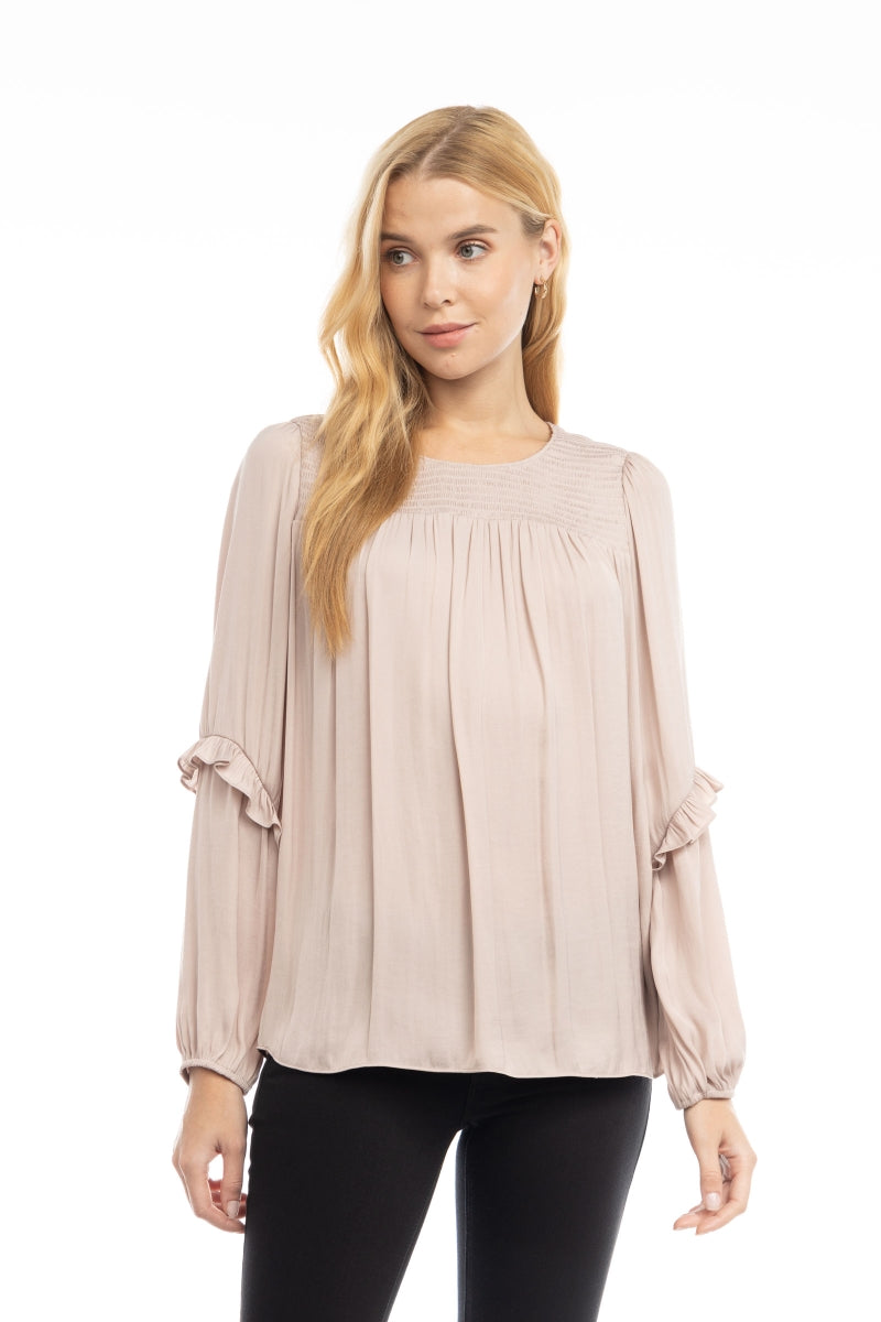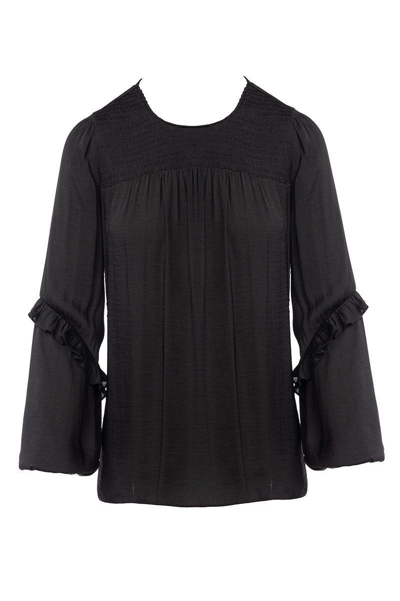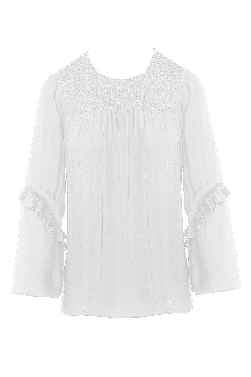 ╴Delicate smocked yoke paired with soft ruffled sleeves for a feminine finish.