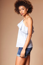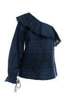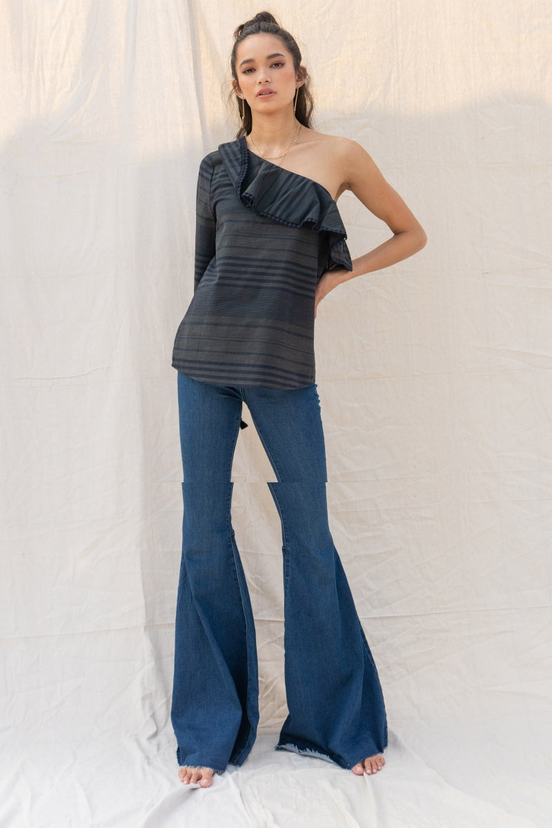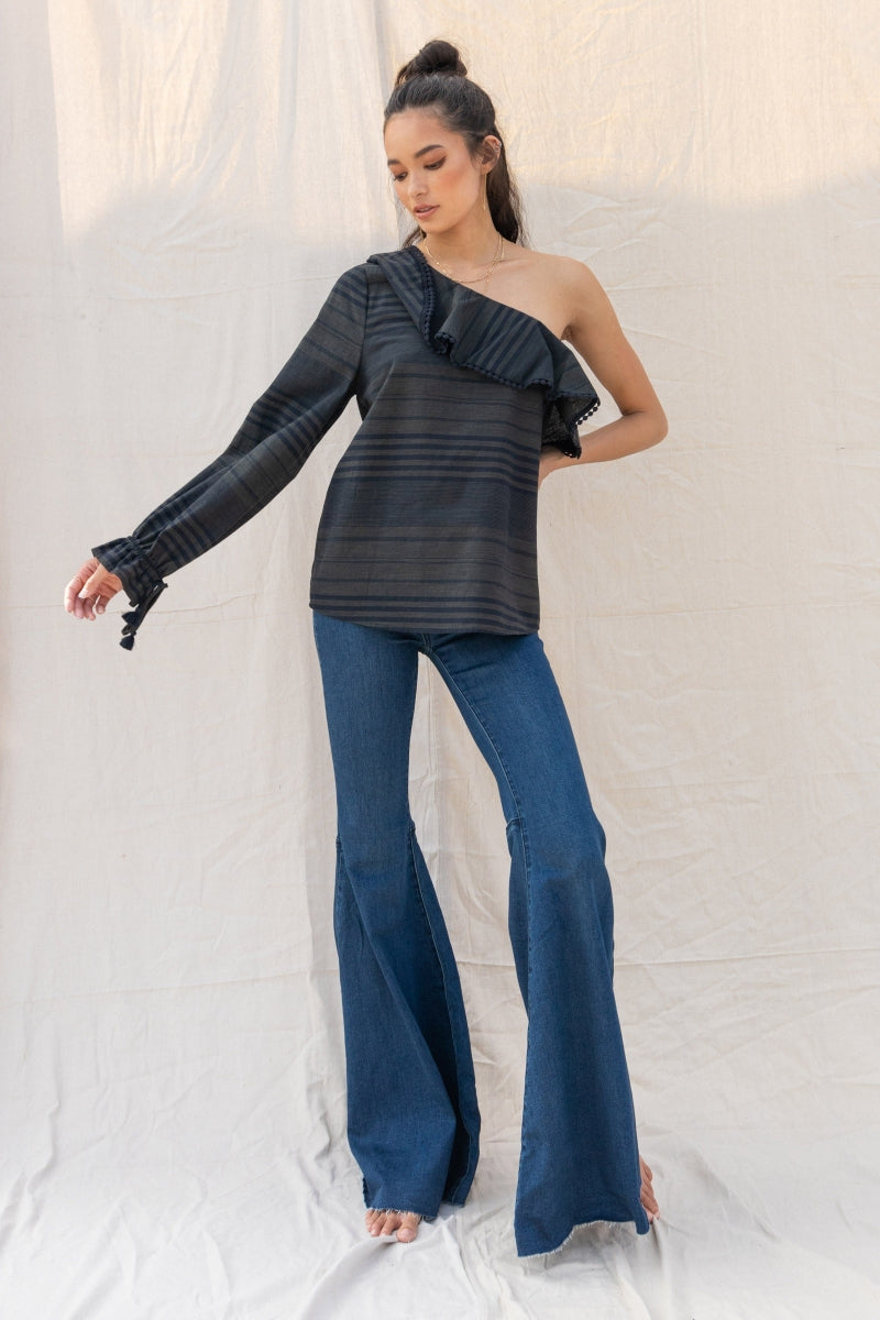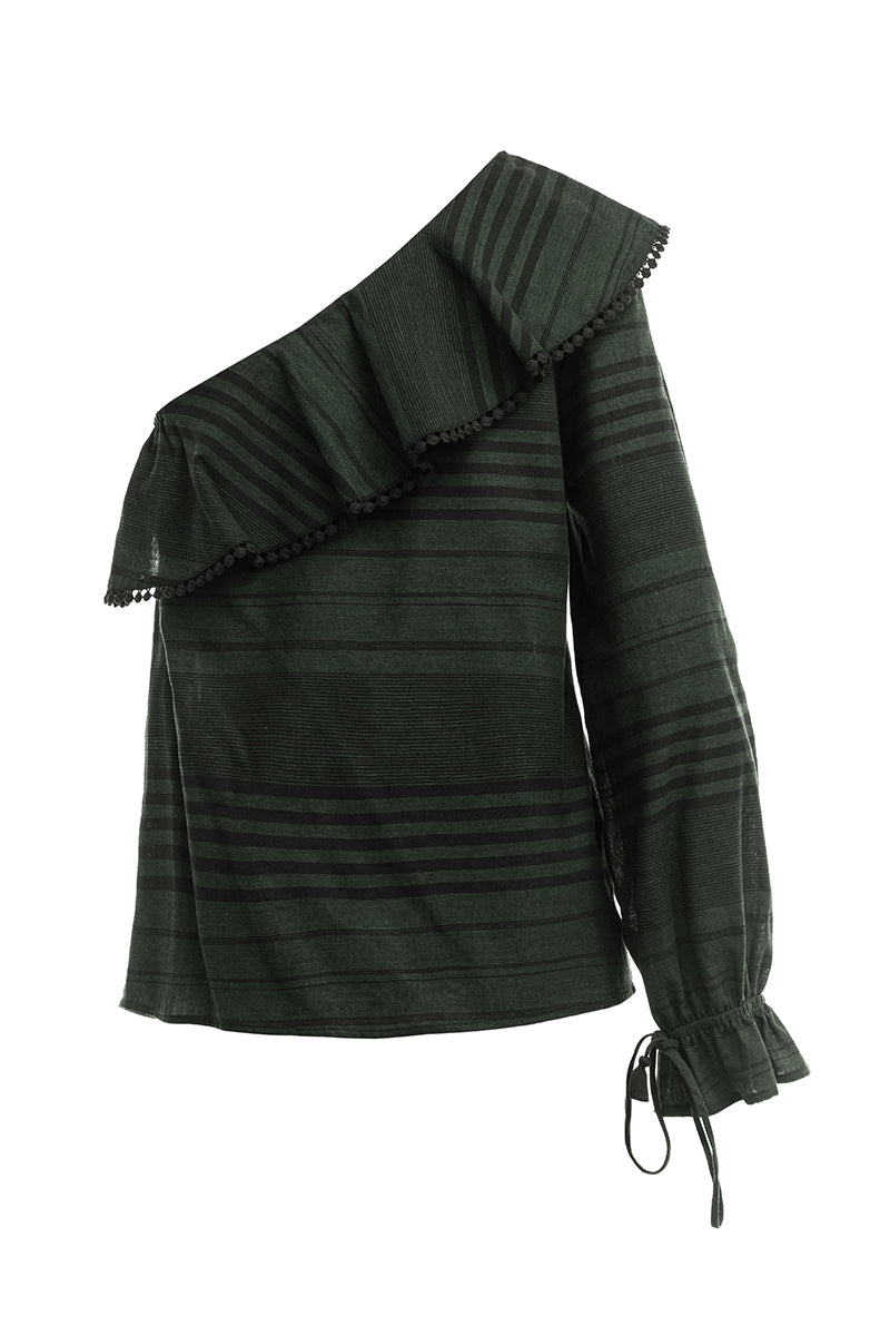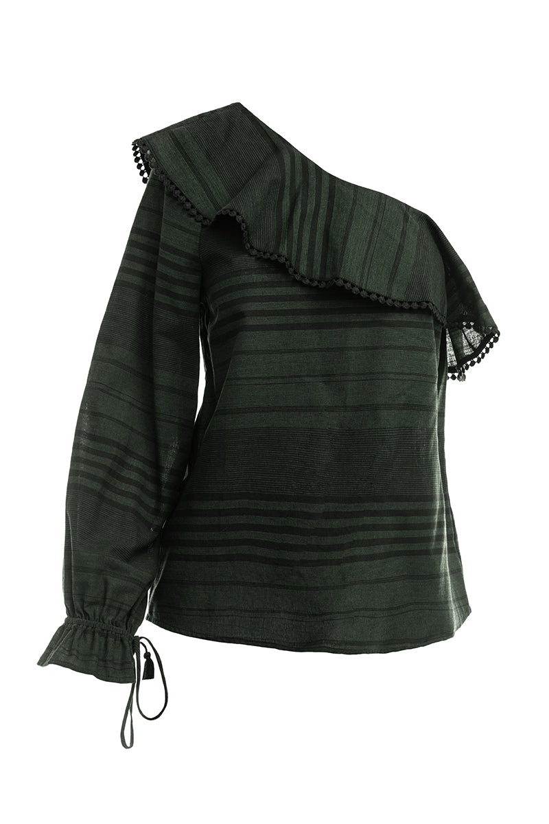 ╴Ruffled one-shoulder neckline finished with tassel ends adds a playful, boho-inspired twist.