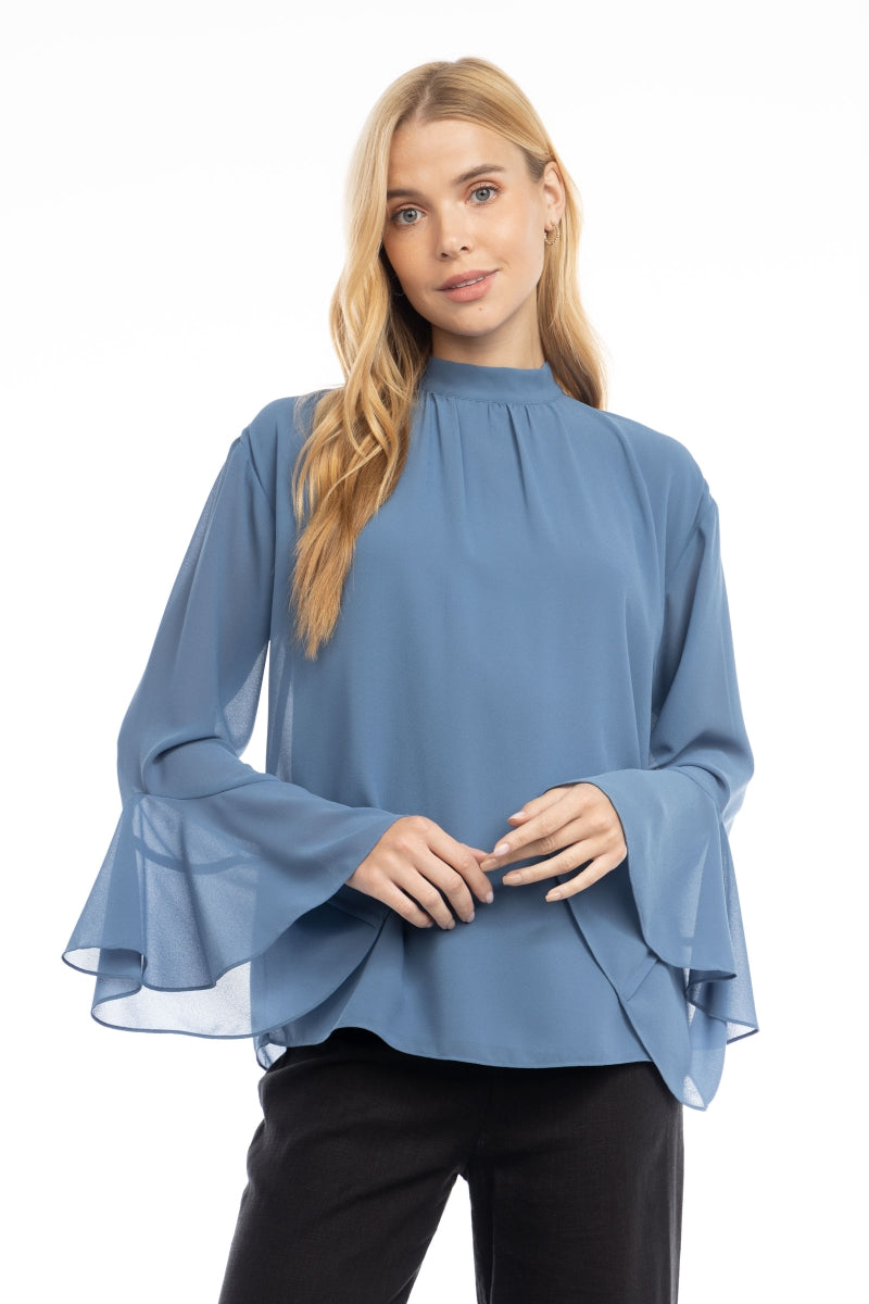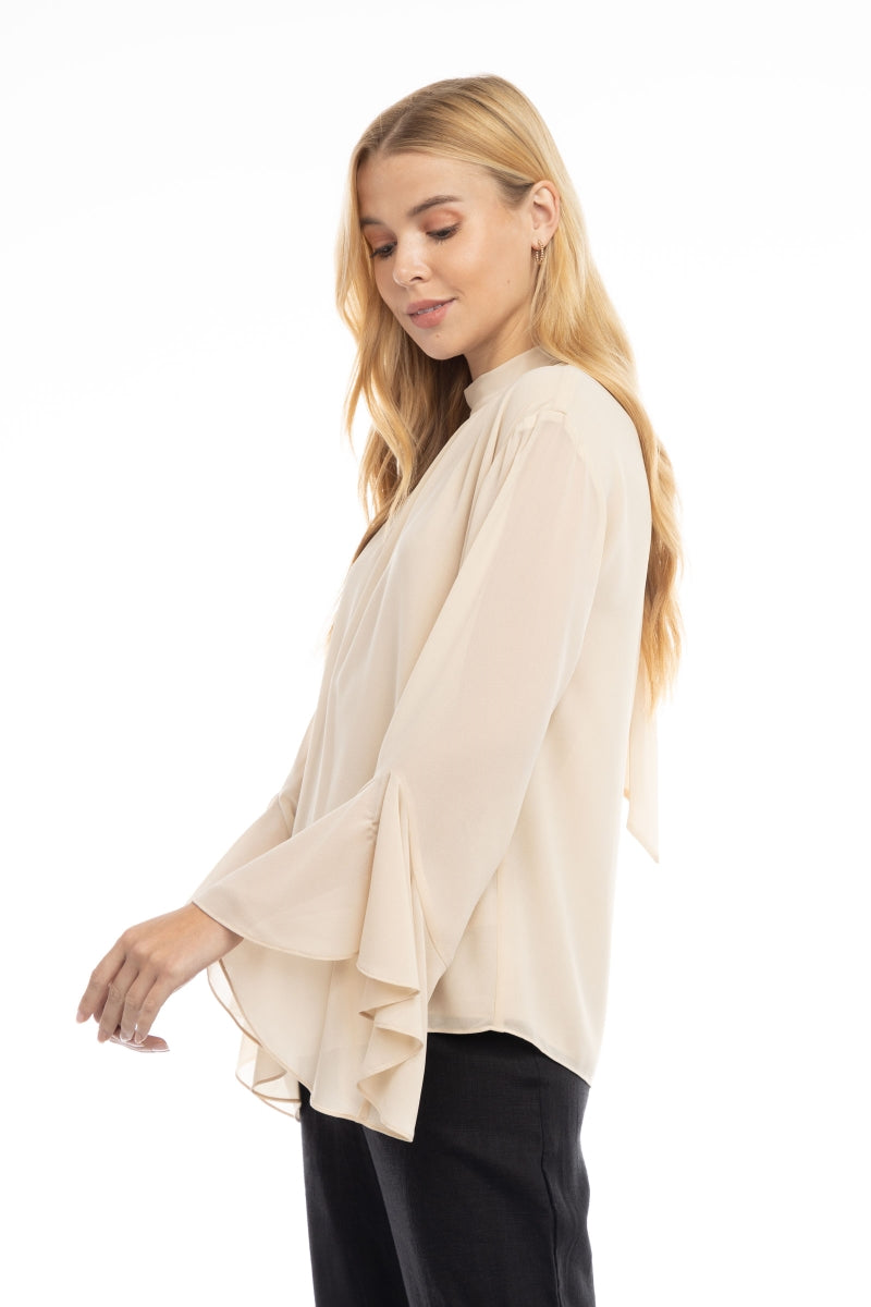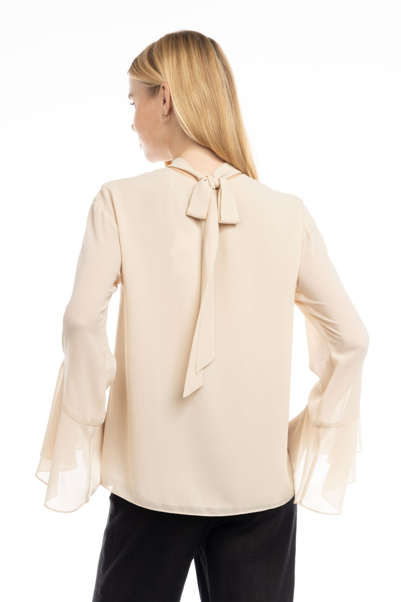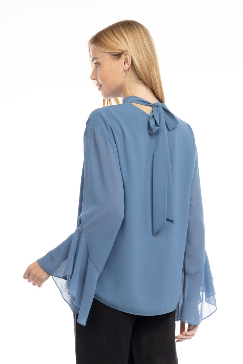 ╴Women's Trumpet Sleeve Blouse with Front Neck Tie.