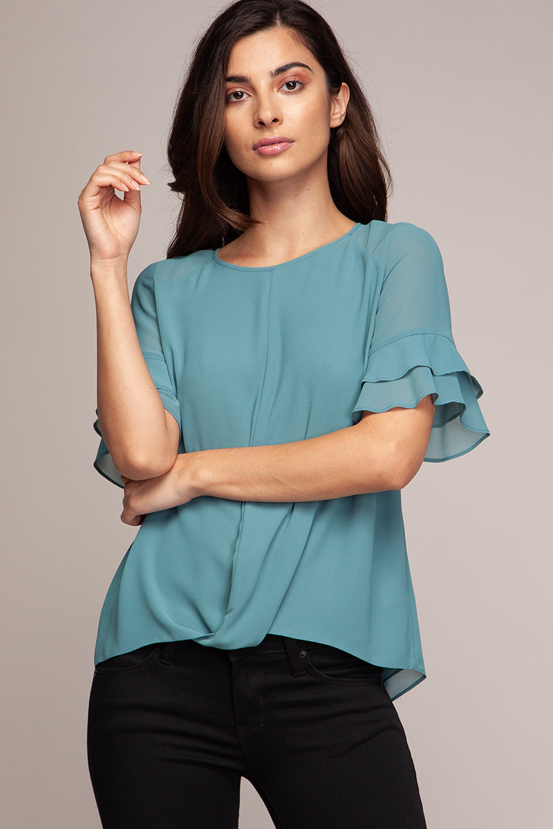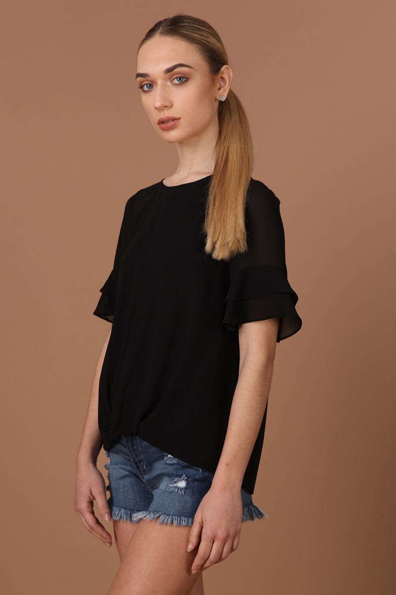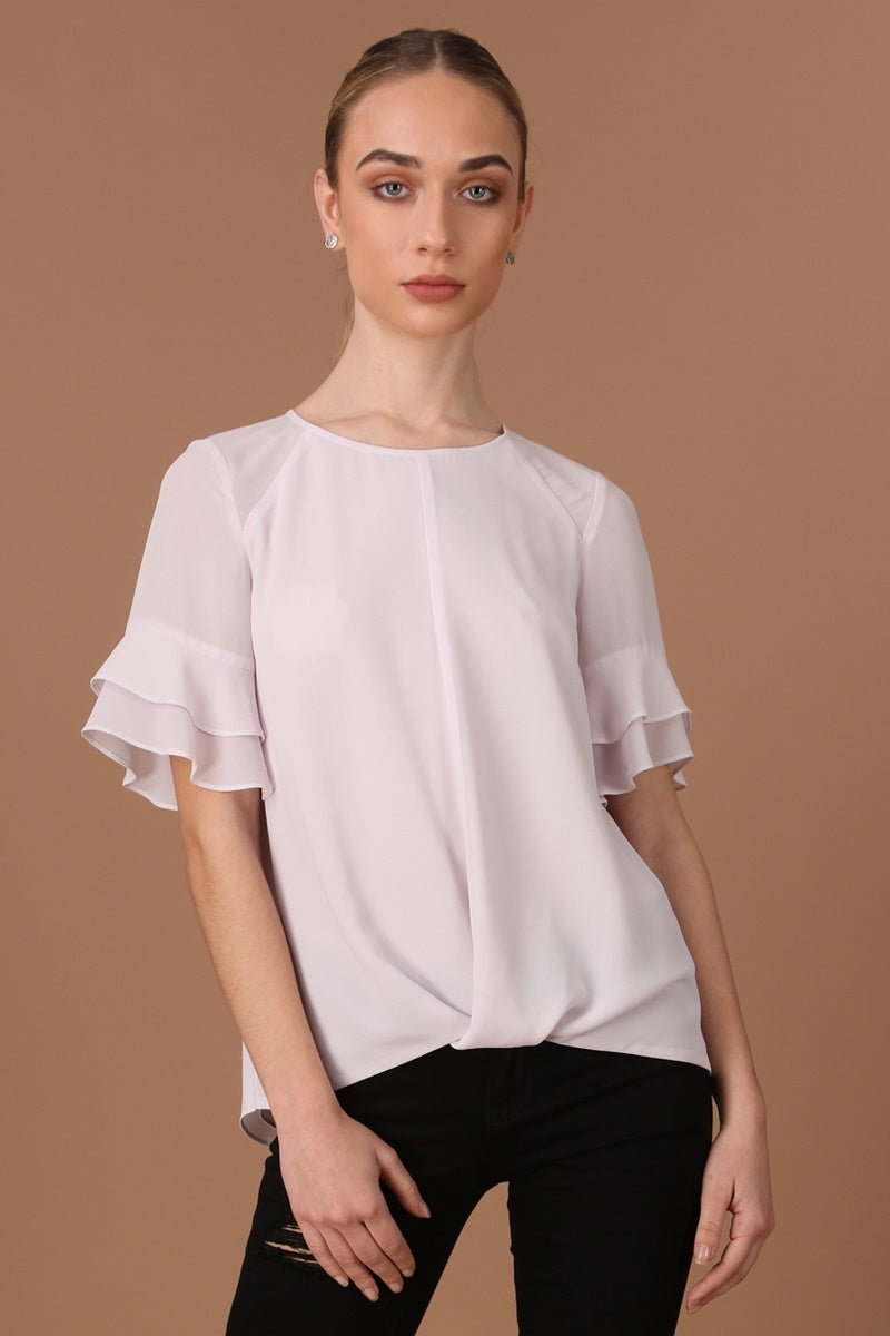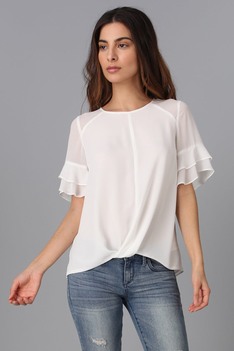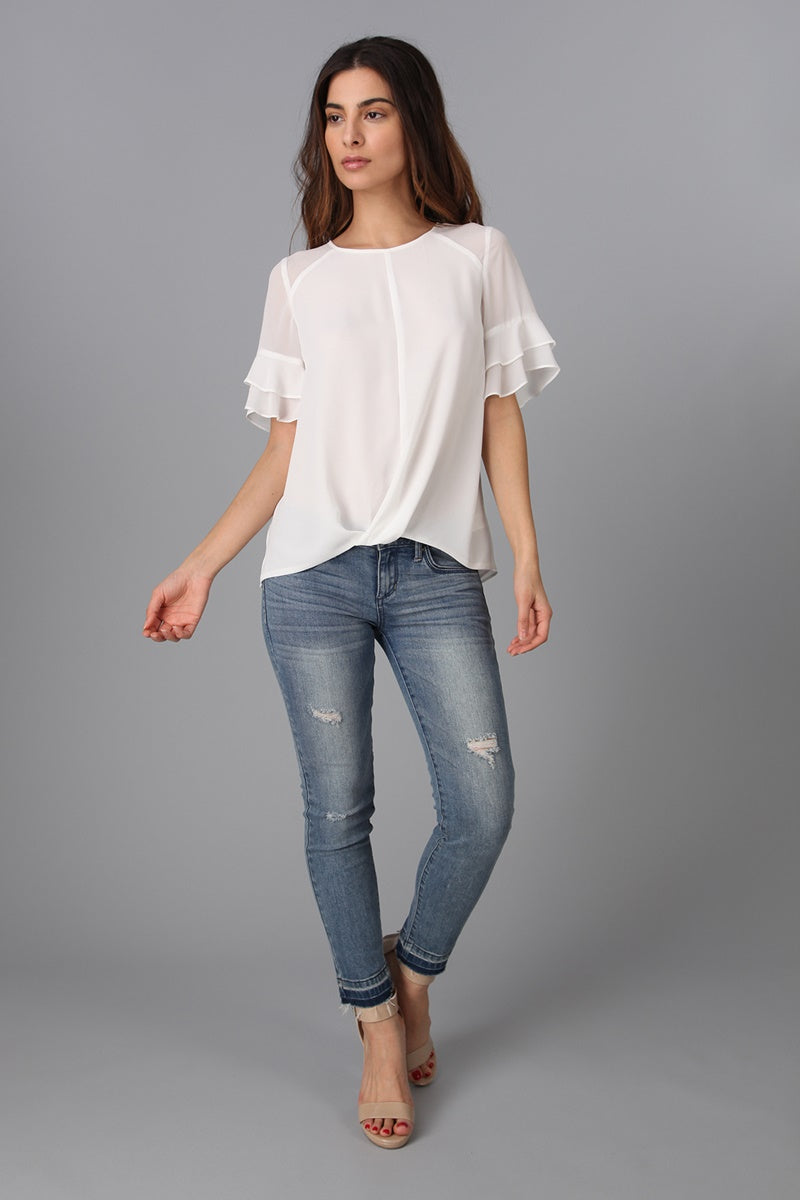 ╴Chic twisted hemline paired with soft ruffle sleeves for a playful, feminine touch.