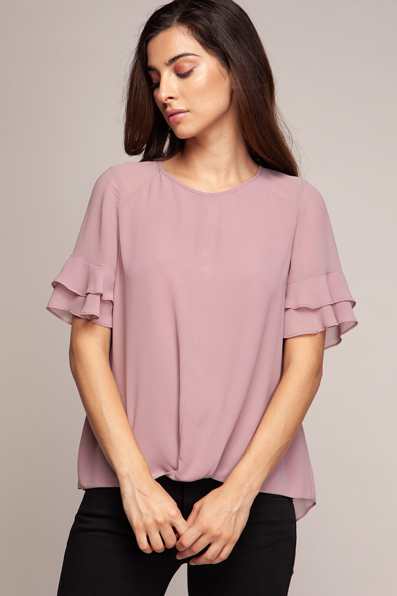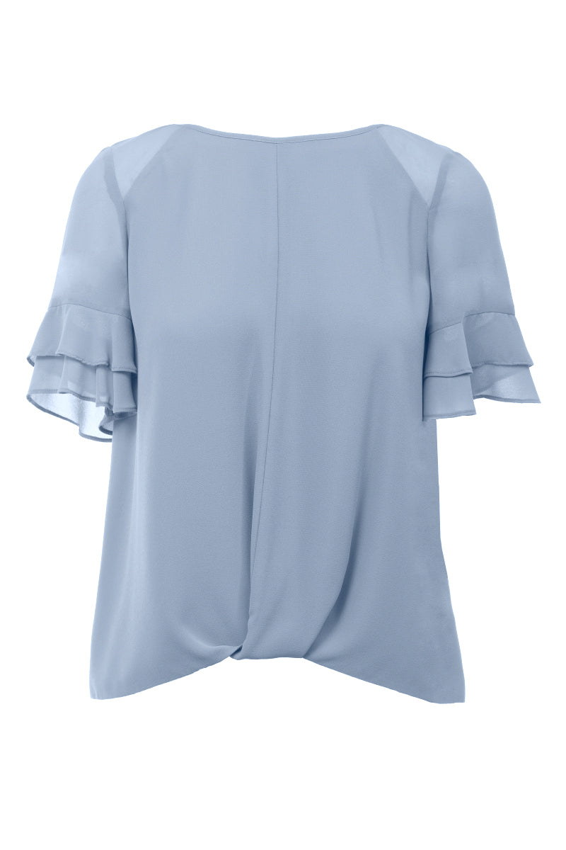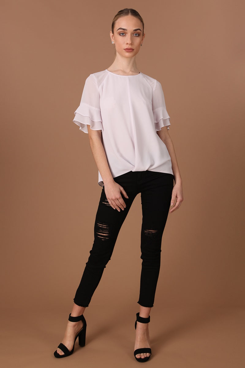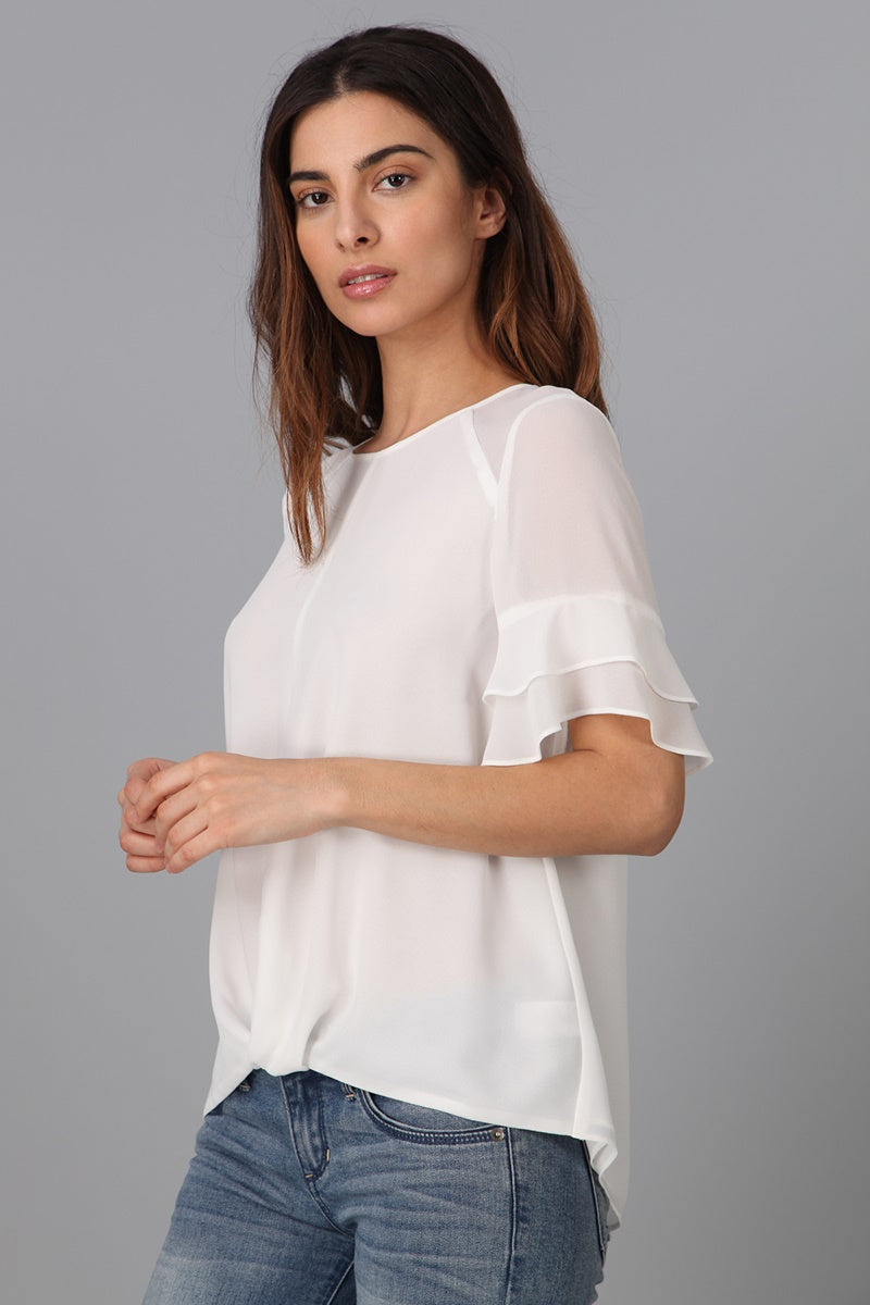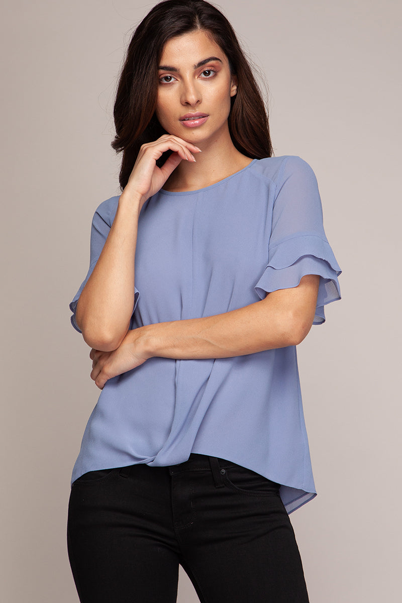╴Chic twisted hemline paired with soft ruffle sleeves for a playful, feminine touch.