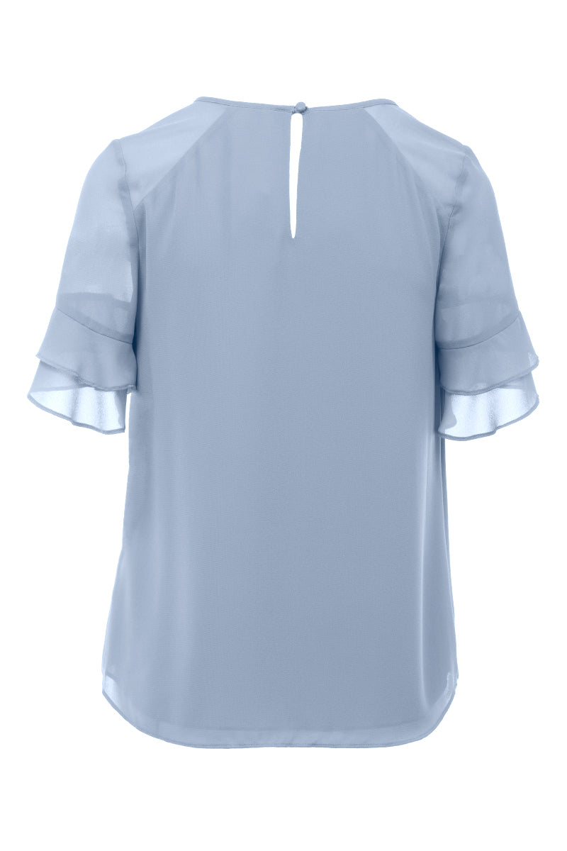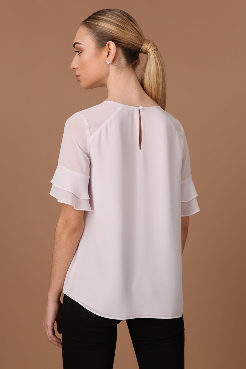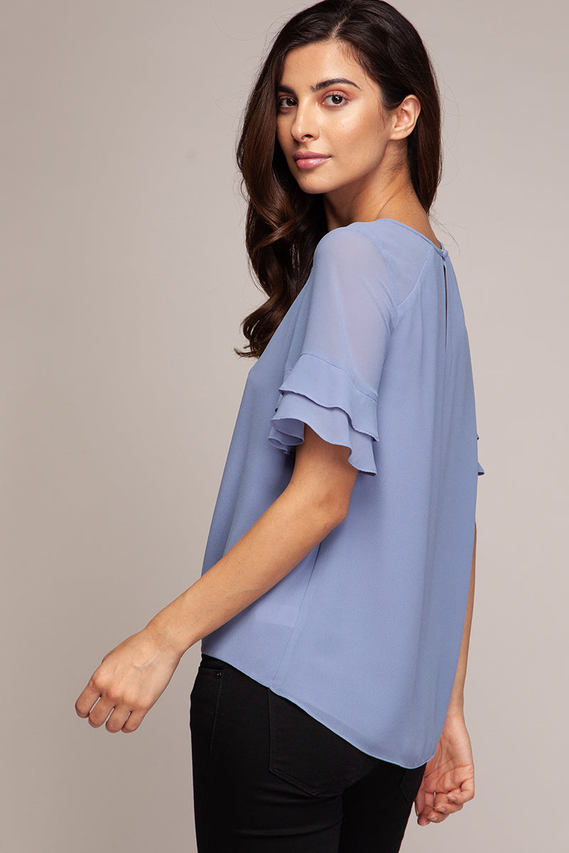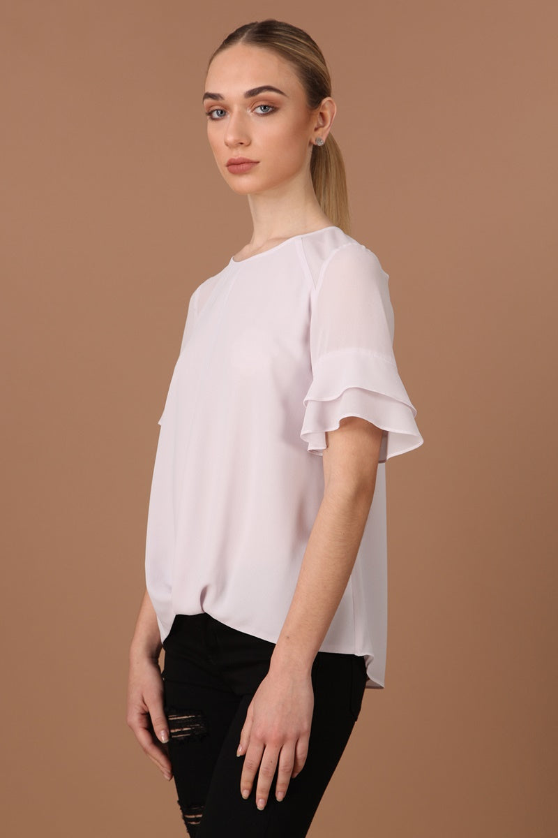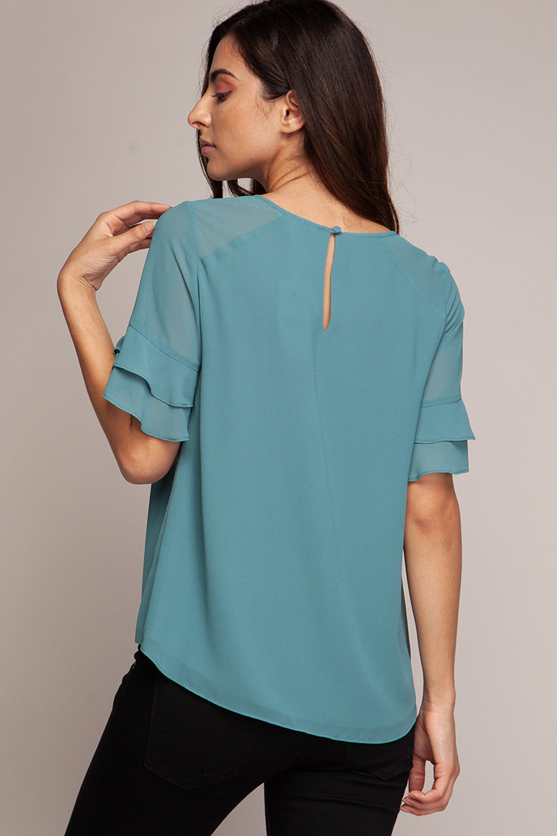╴Chic twisted hemline paired with soft ruffle sleeves for a playful, feminine touch.