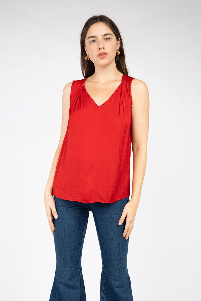 ╴Women's V-Neck Sleeveless Top with Bead Trim Detail