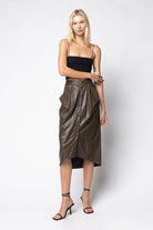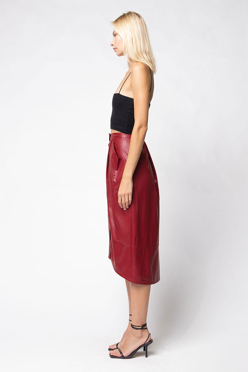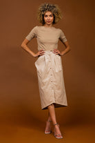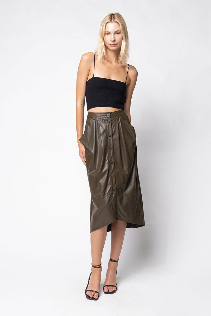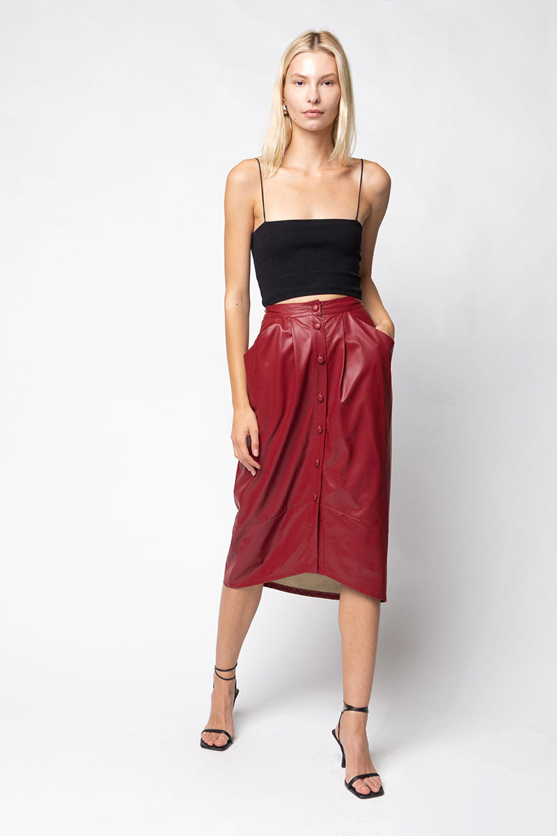 The Vegan Leather Button Down Pencil Skirt combines contemporary fashion with ethical choices, made from high-quality vegan leather. This sleek pencil skirt features a stylish button-down front, adding a touch of sophistication to any outfit. Its form-fitting design accentuates your silhouette while providing comfort and versatility for various occasions.
