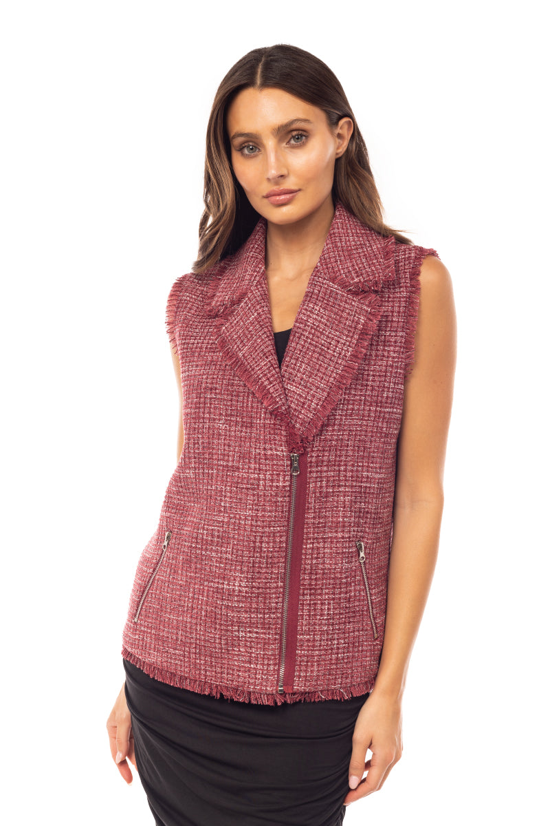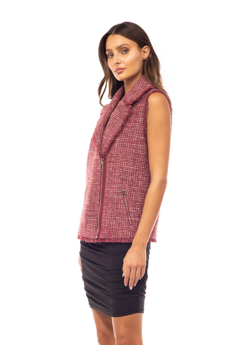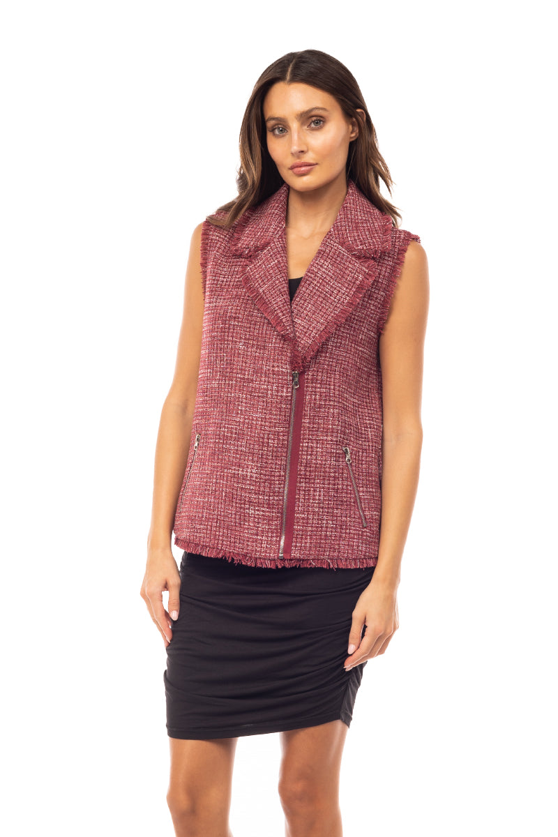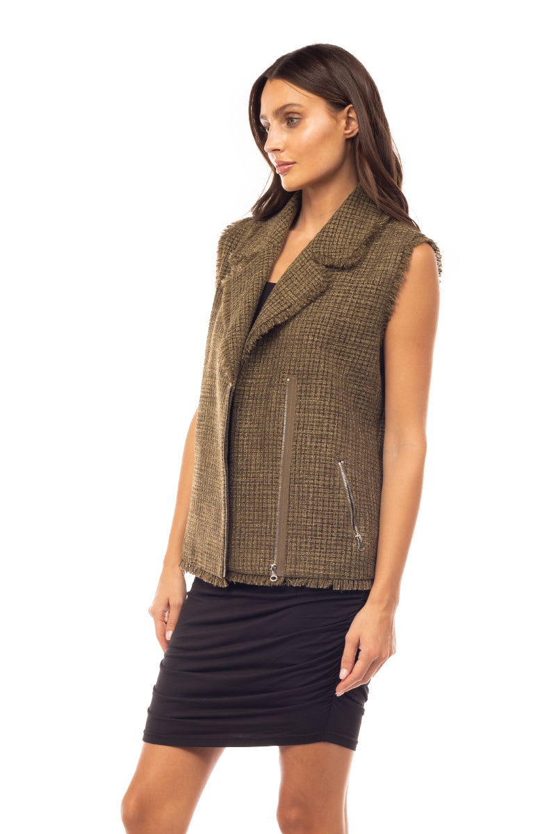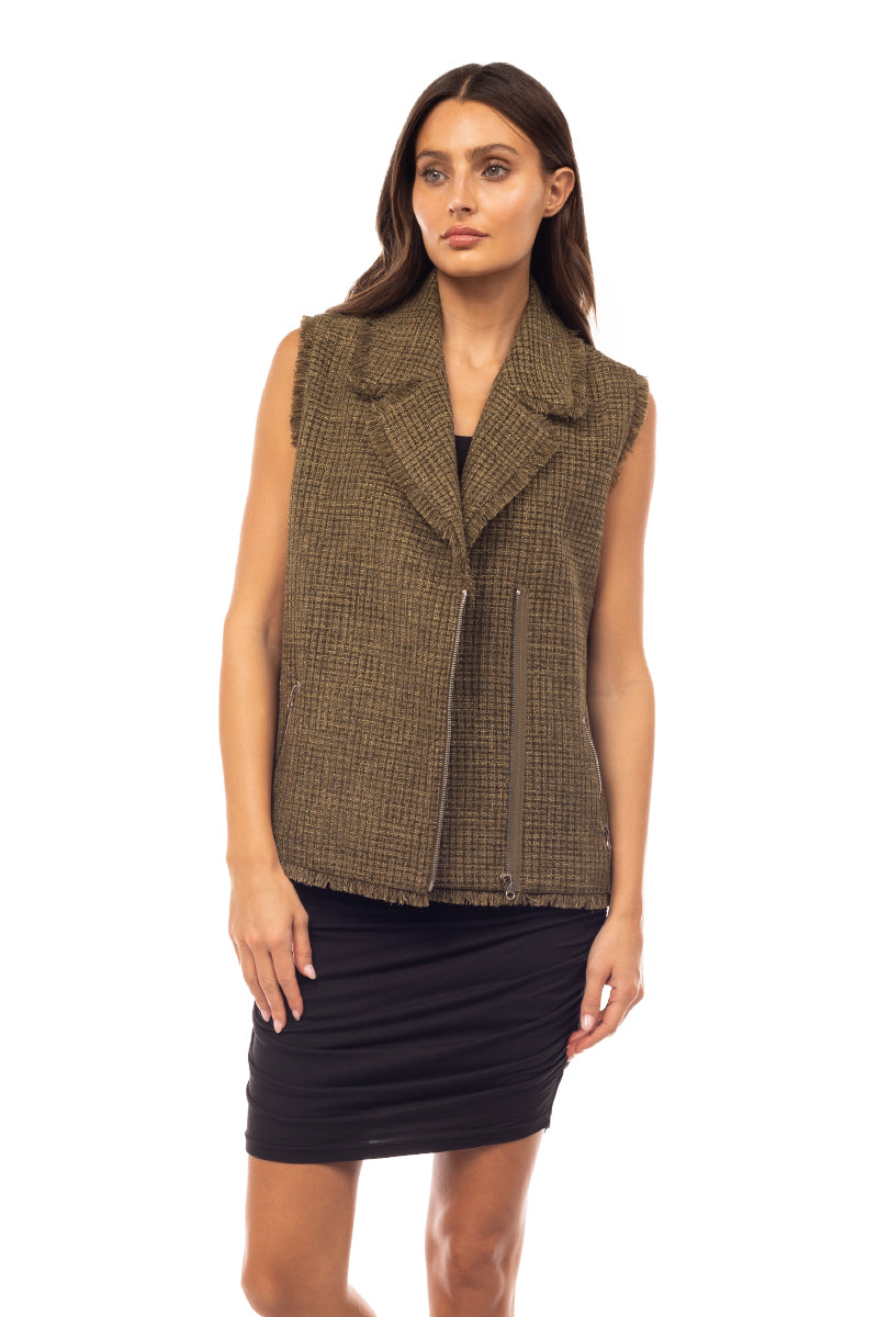Women's Tweed Vest With Front Zipper And Fringe Detail