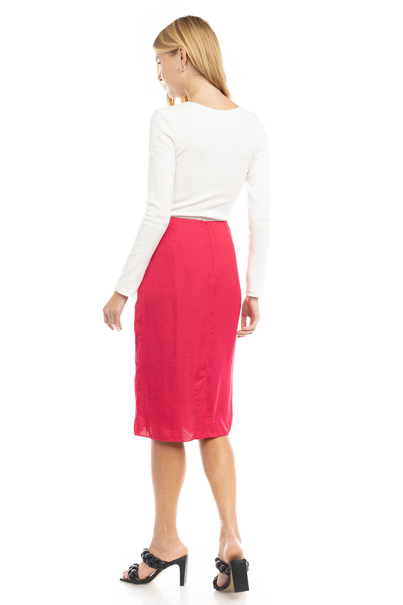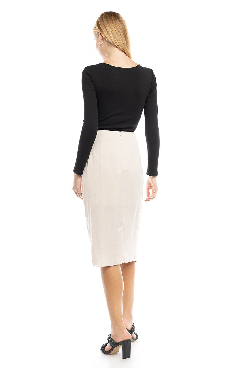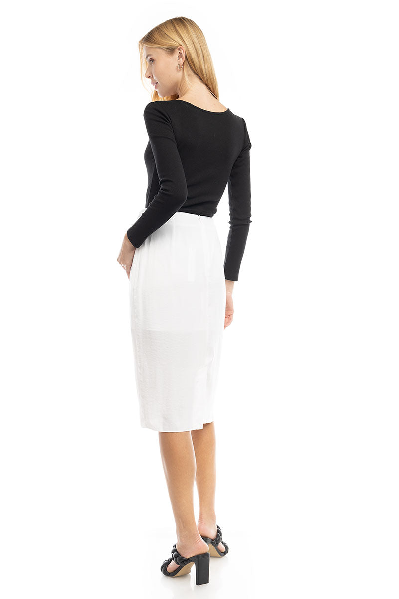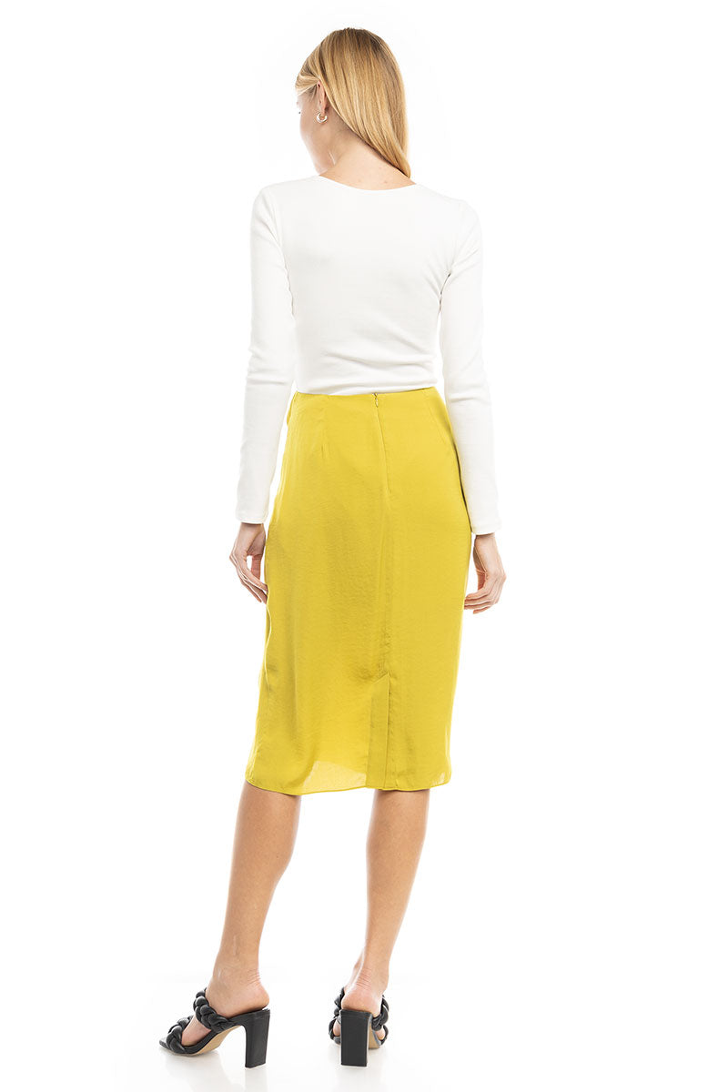 This A-line midi skirt features a waterfall detail that adds a touch of elegance to any outfit. The flowy design creates a flattering silhouette, making it a versatile piece for any occasion. Made with high-quality materials, this skirt offers both style and comfort.